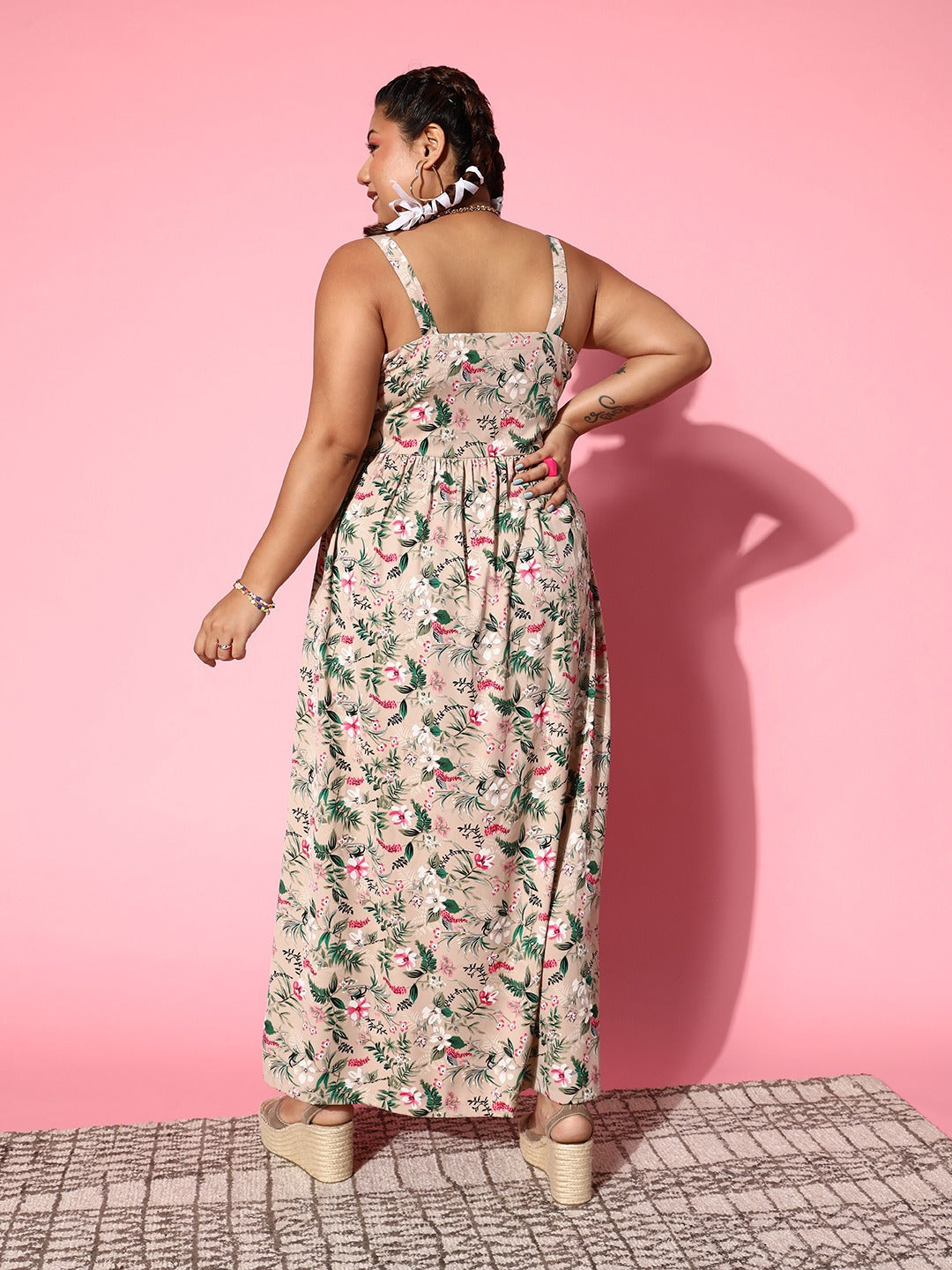 Berrylush Women Plus Size Pink & Green Floral Printed V-Neck Front Button-Up Flared Maxi Dress