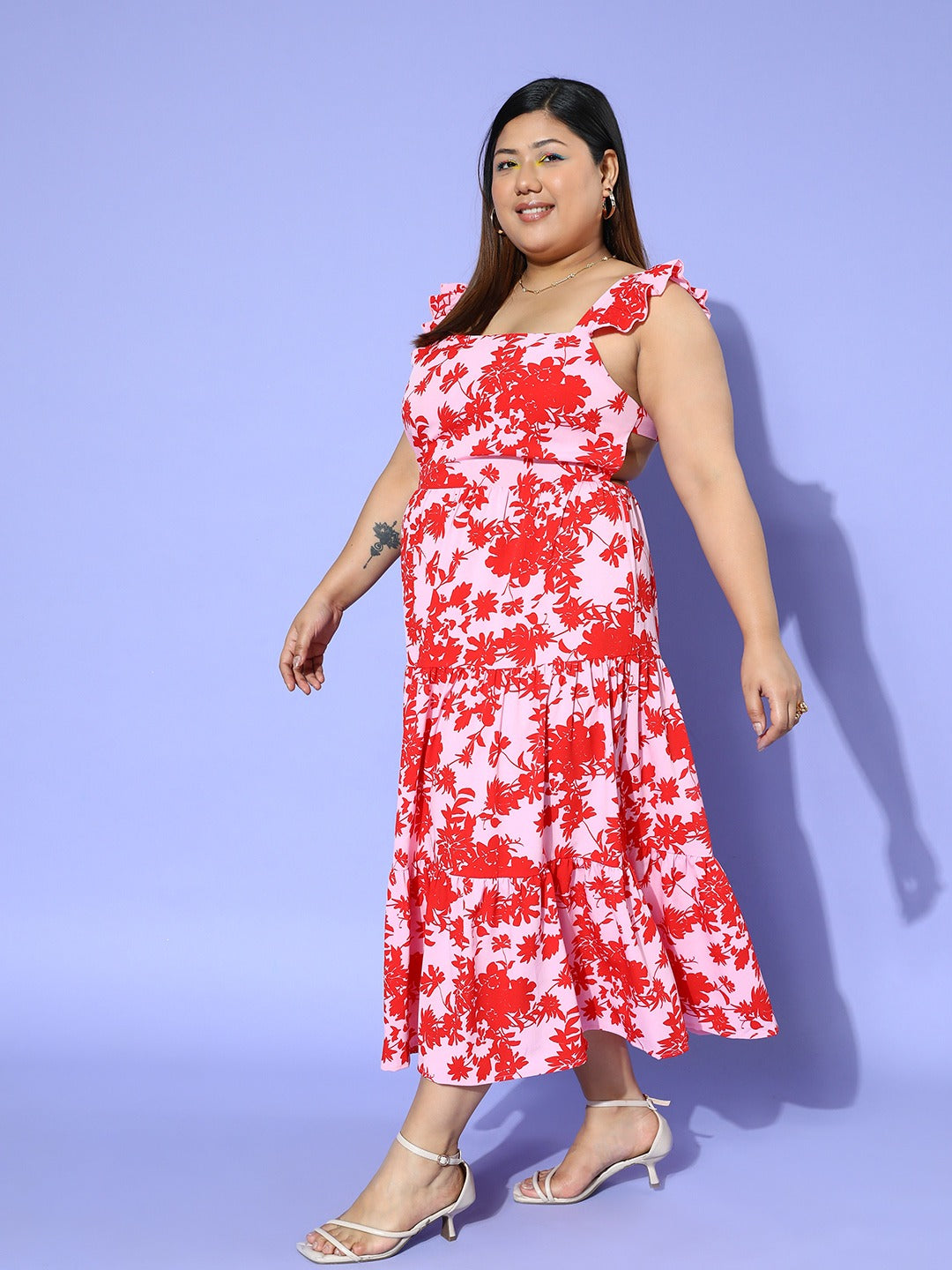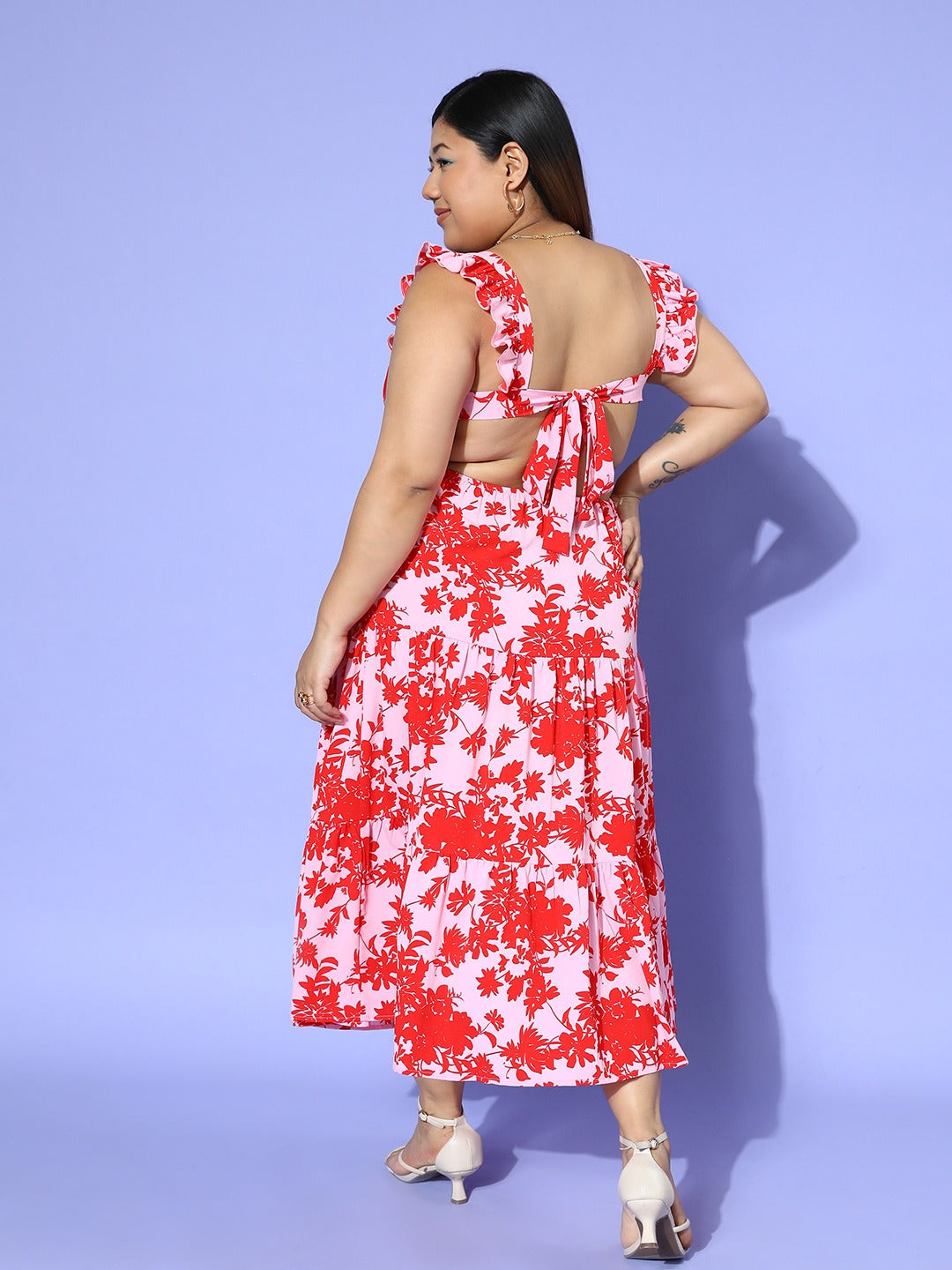 Berrylush Women Plus Size Pink & Red Tropical Printed Square Neck Cutout Tie-Up Backless Crepe Flared A-Line Maxi Dress