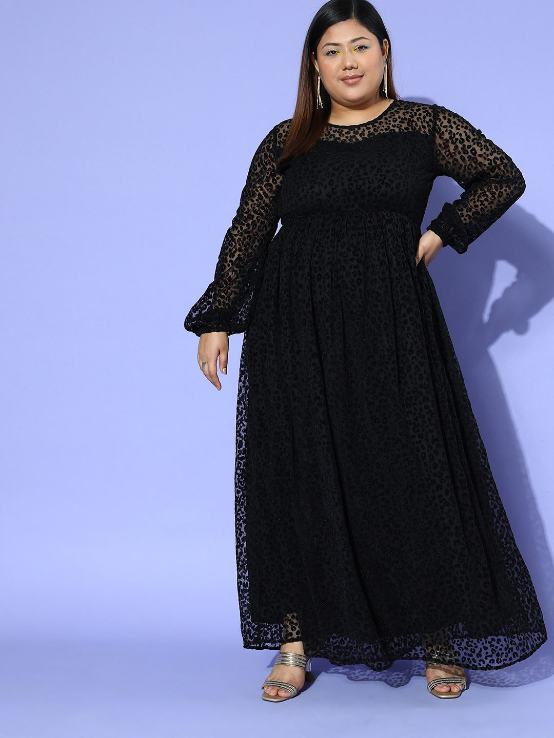 Berrylush Women Plus Size Black Animal Printed Round Neck Semi-Sheer Velvet Flared A-Line Maxi Dress