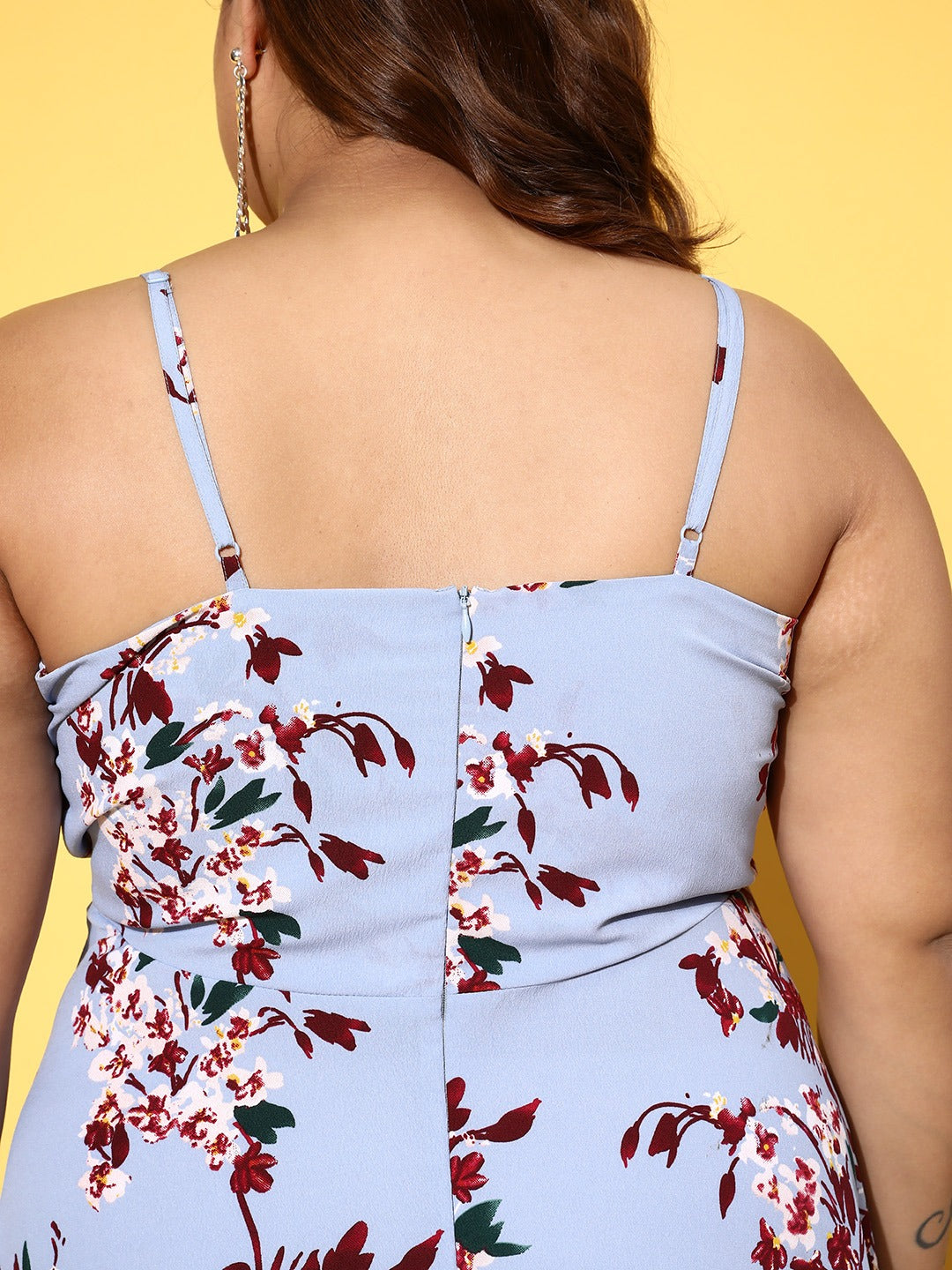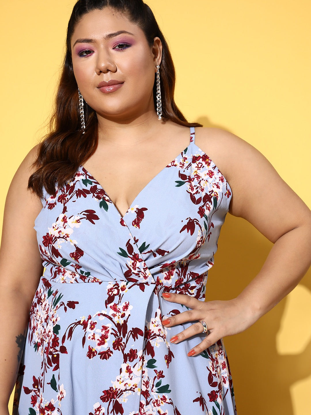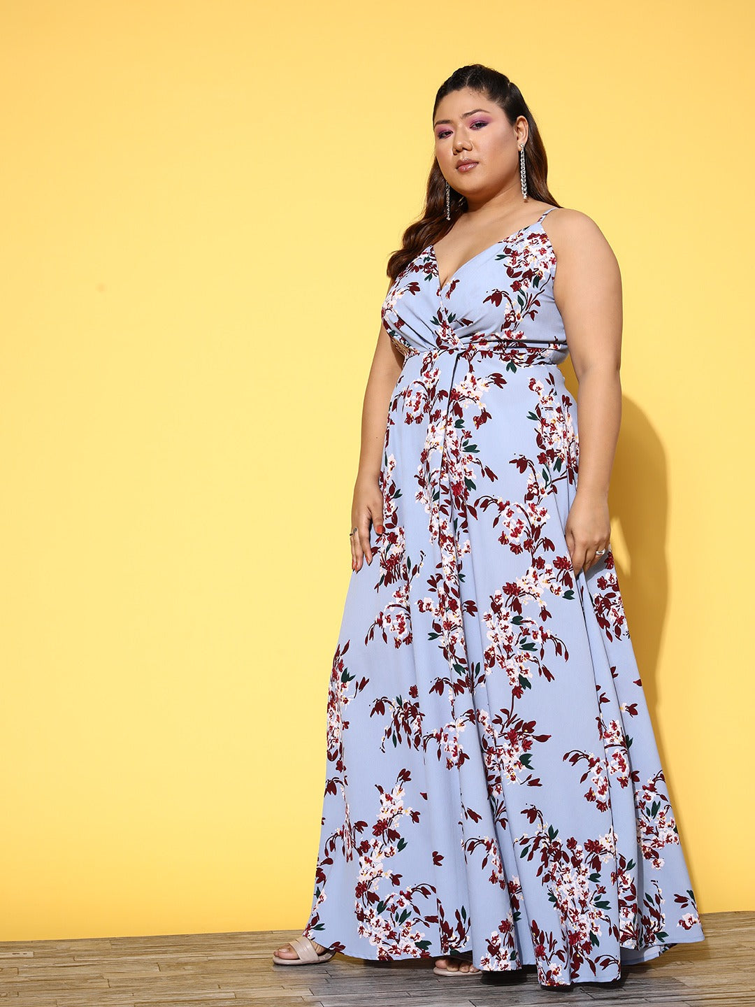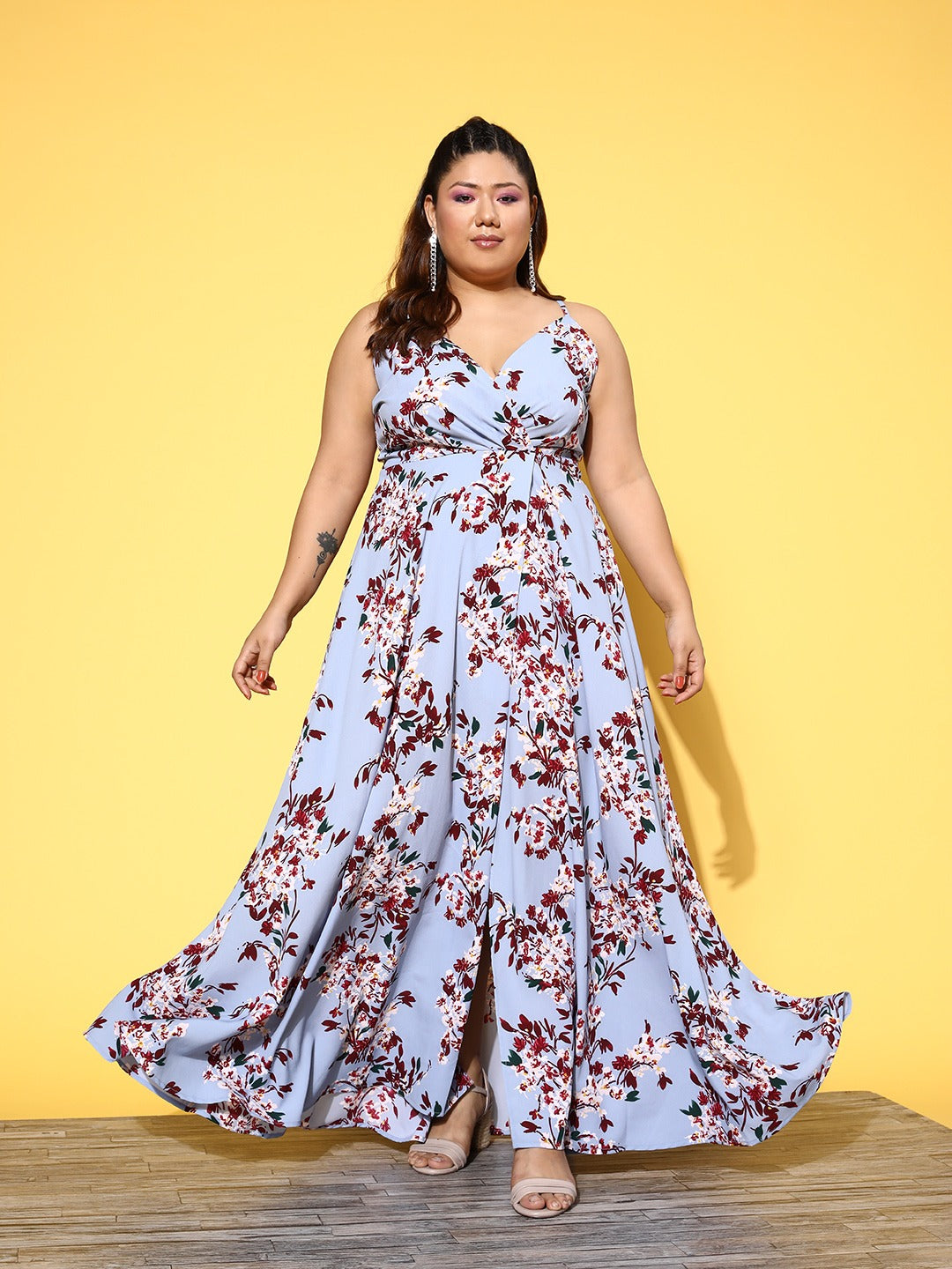 Berrylush Women Plus Size Blue & Maroon Floral Printed V-Neck Sleeveless Crepe Thigh-High Slit Fit & Flare Maxi Dress