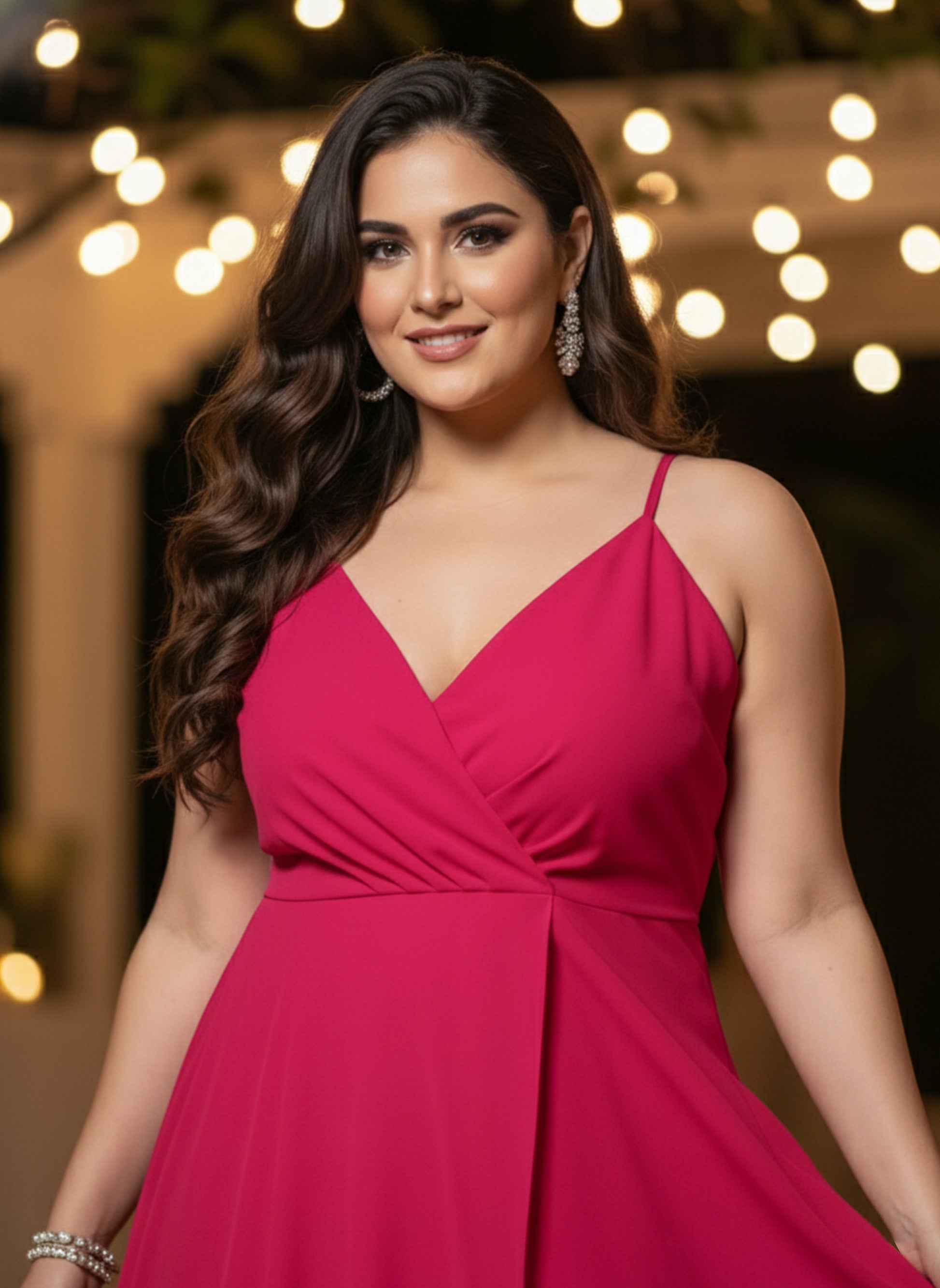 Berrylush Women Plus Size Solid Pink V-Neck Sleeveless Crepe Thigh-High Slit Fit & Flare Wrap Maxi Dress
