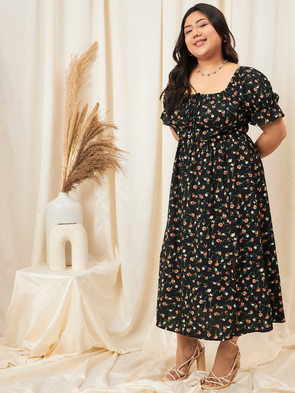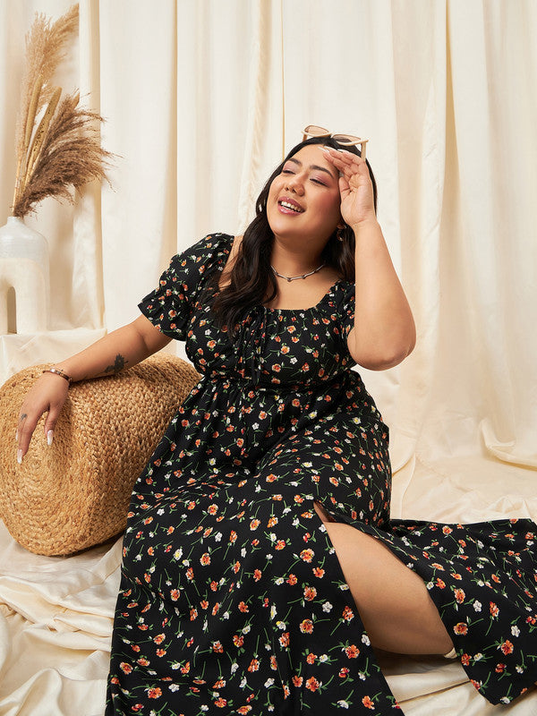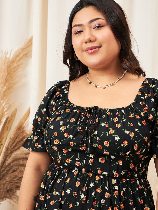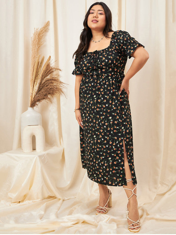 Berrylush Curve Women Black & Orange Floral Printed Square Neck Tie-Up Front Thigh-High Slit Flared A-Line Midi Dress