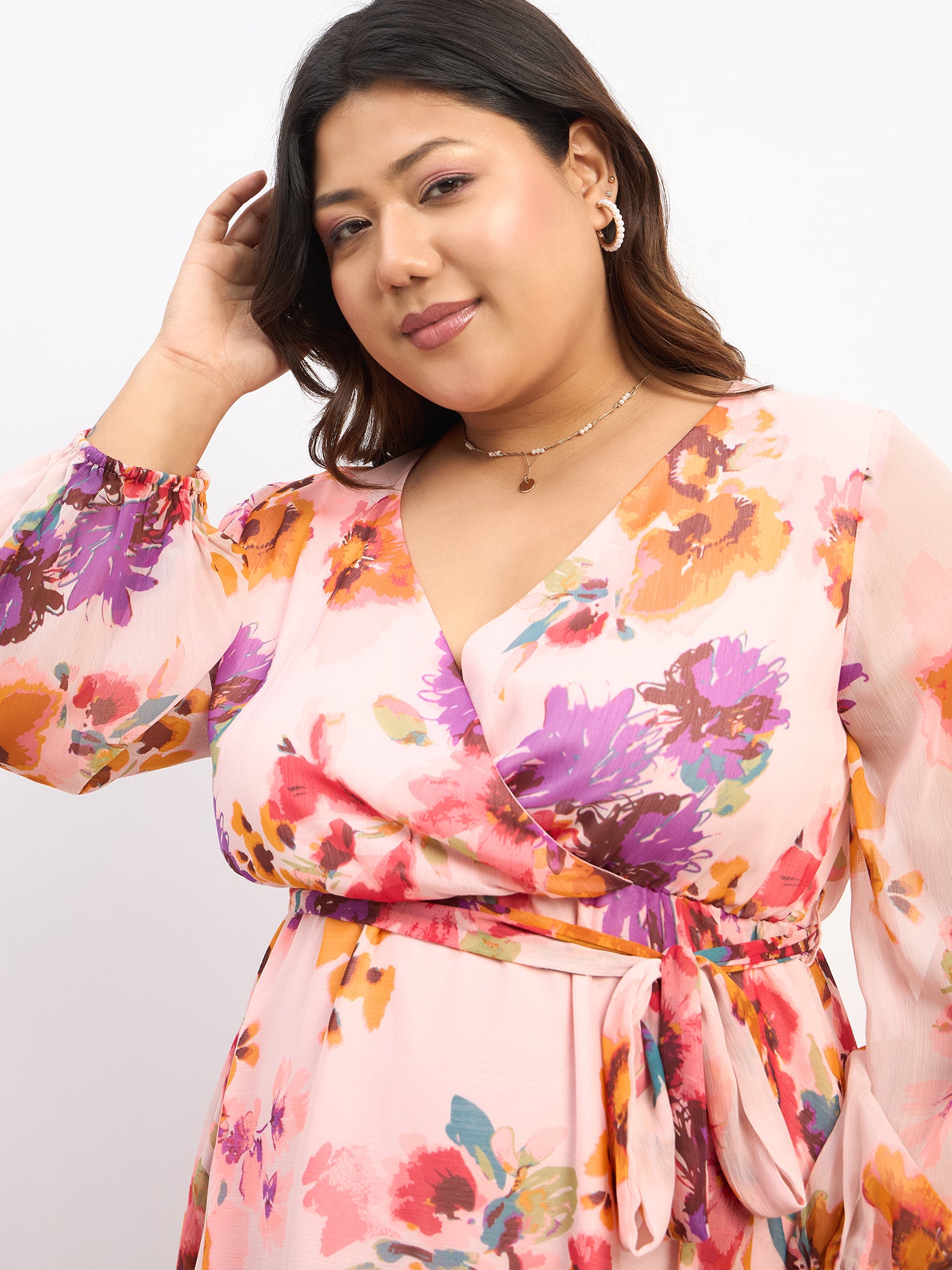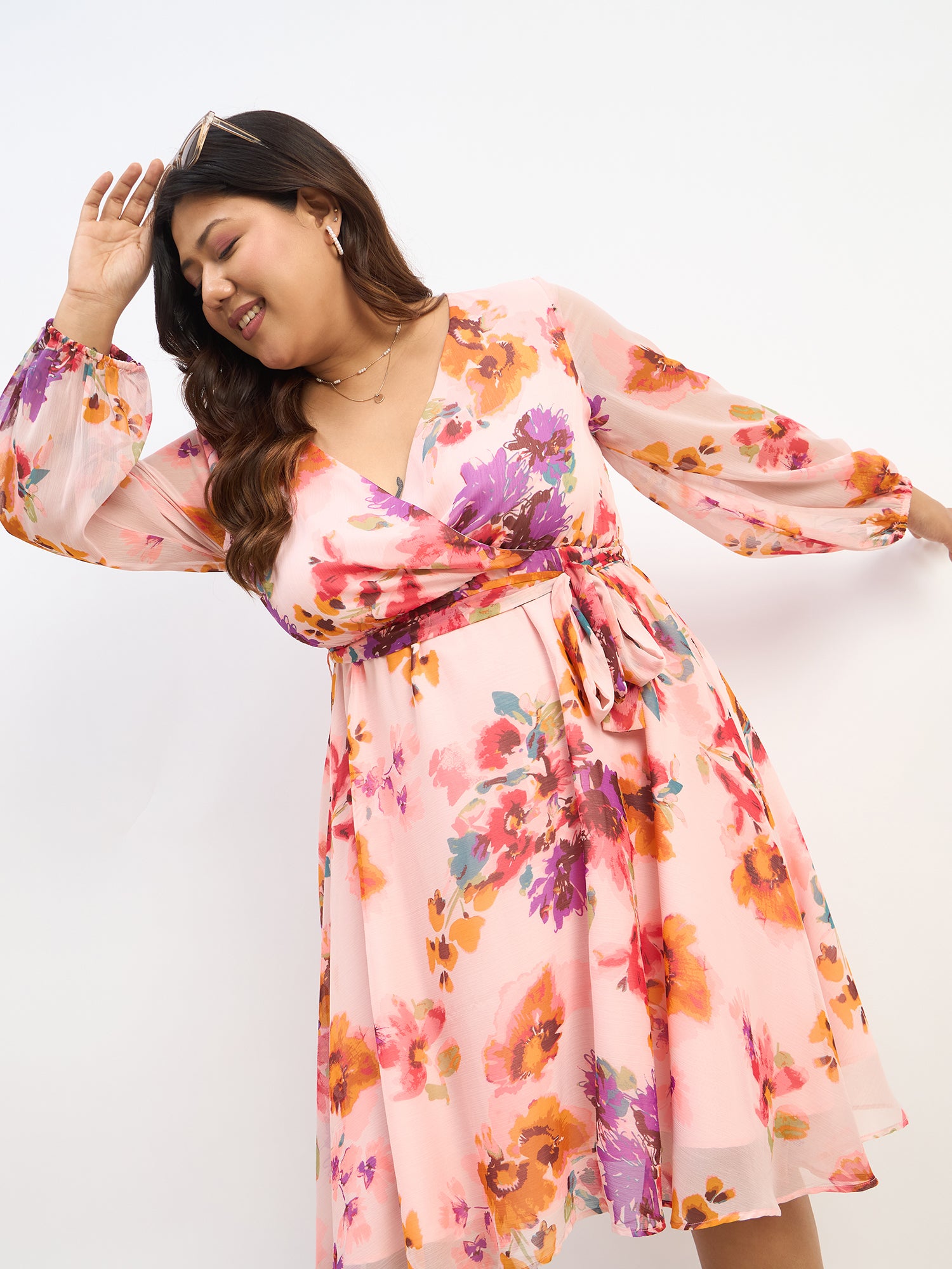 Berrylush Curve Women Pink & Purple Floral Printed V-Neck Bishop Sleeves Tie-Up Waist Pleated Fit & Flare Mini Dress