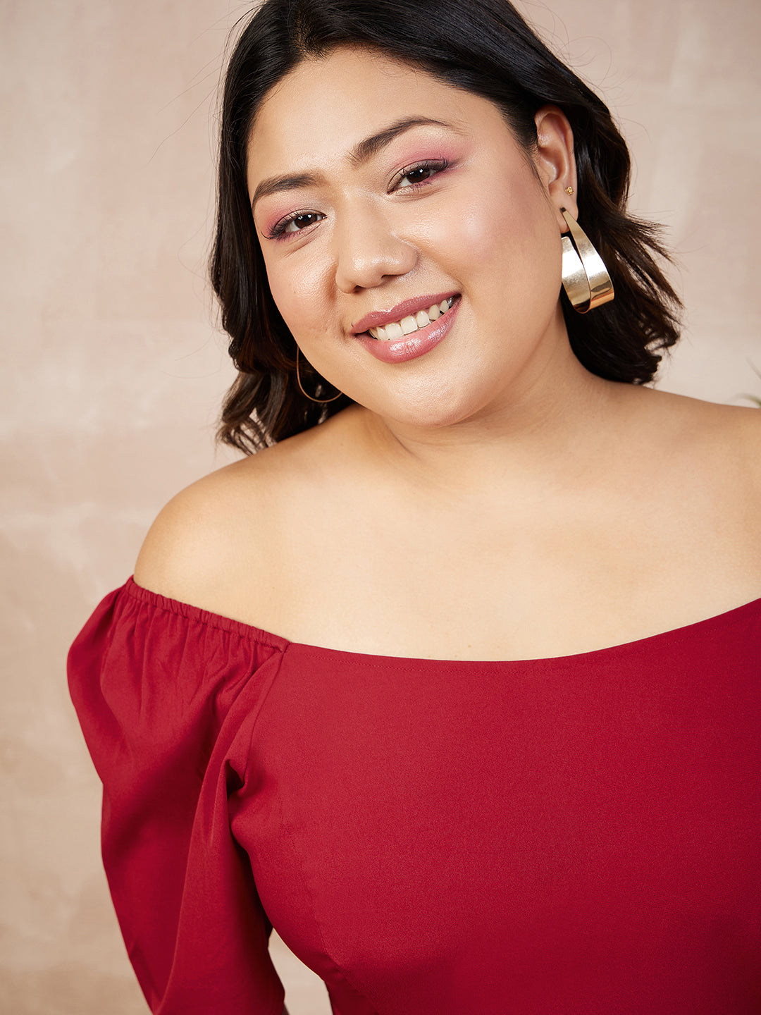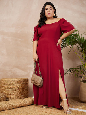 Berrylush Women Plus Size Solid Red Square Neck Puff Sleeve Thigh-High Slit Flared Maxi Dress