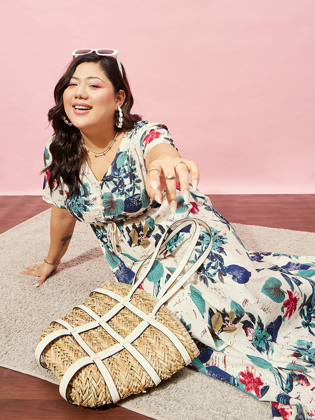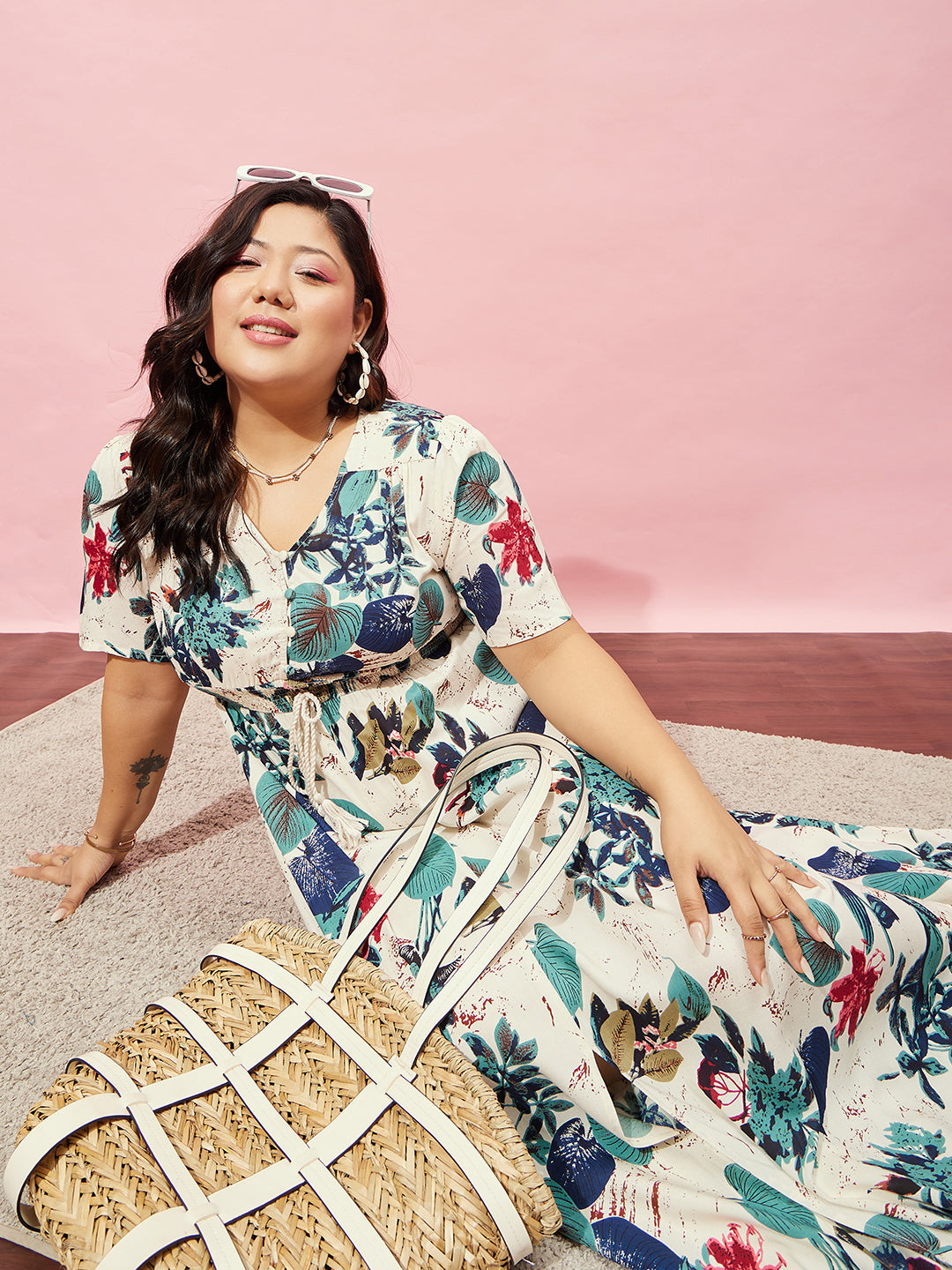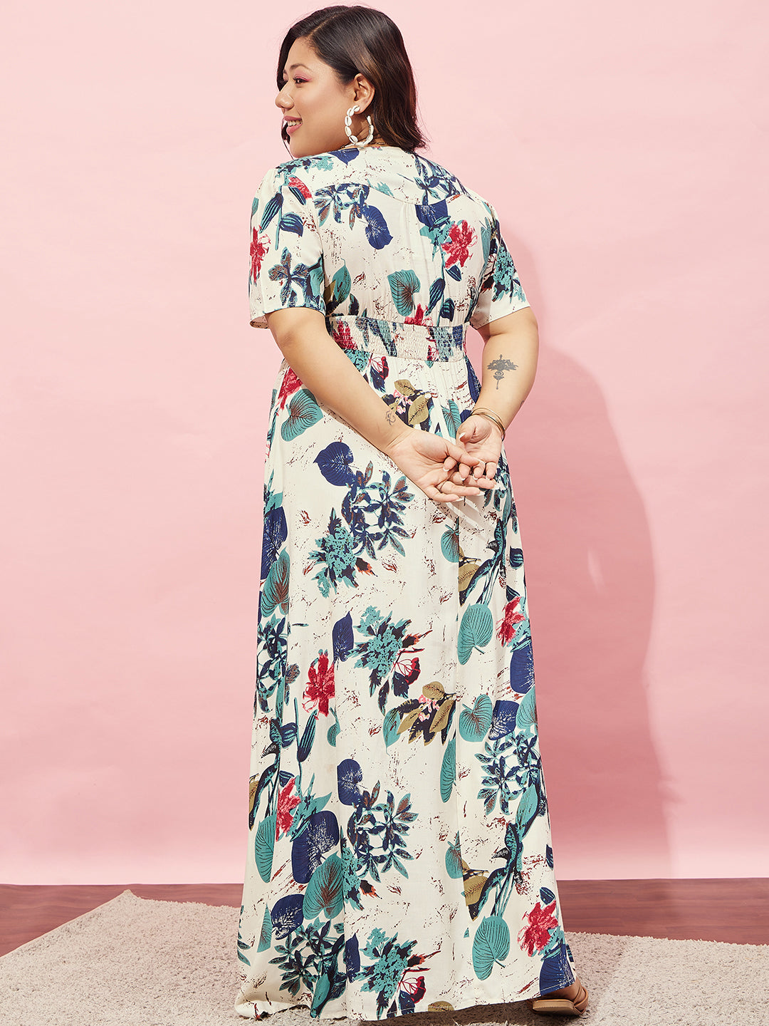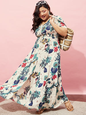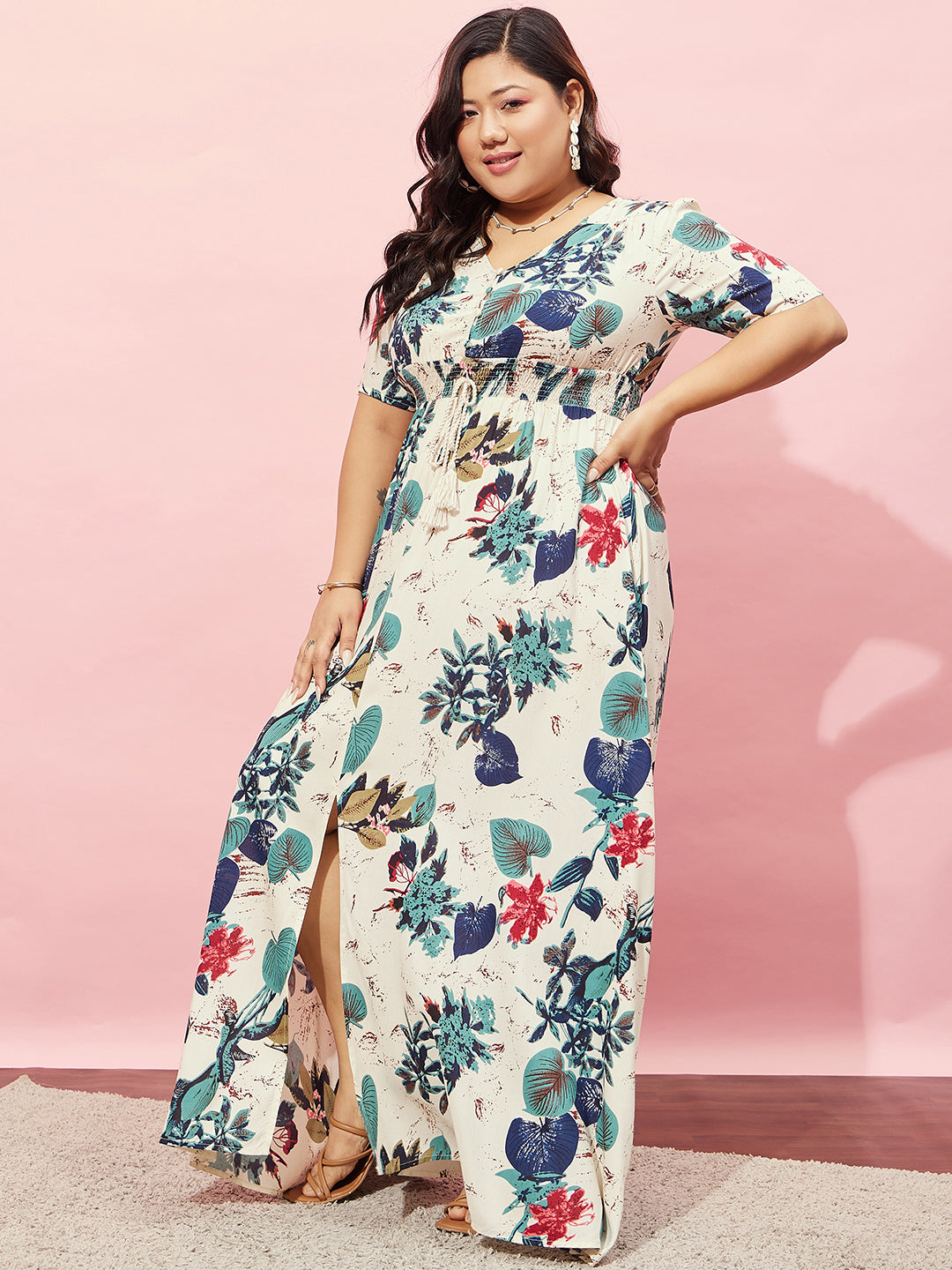 Berrylush Women Plus Size White & Multicolour Floral Printed V-Neck Straight Hem Thigh-High Slit Maxi Dress