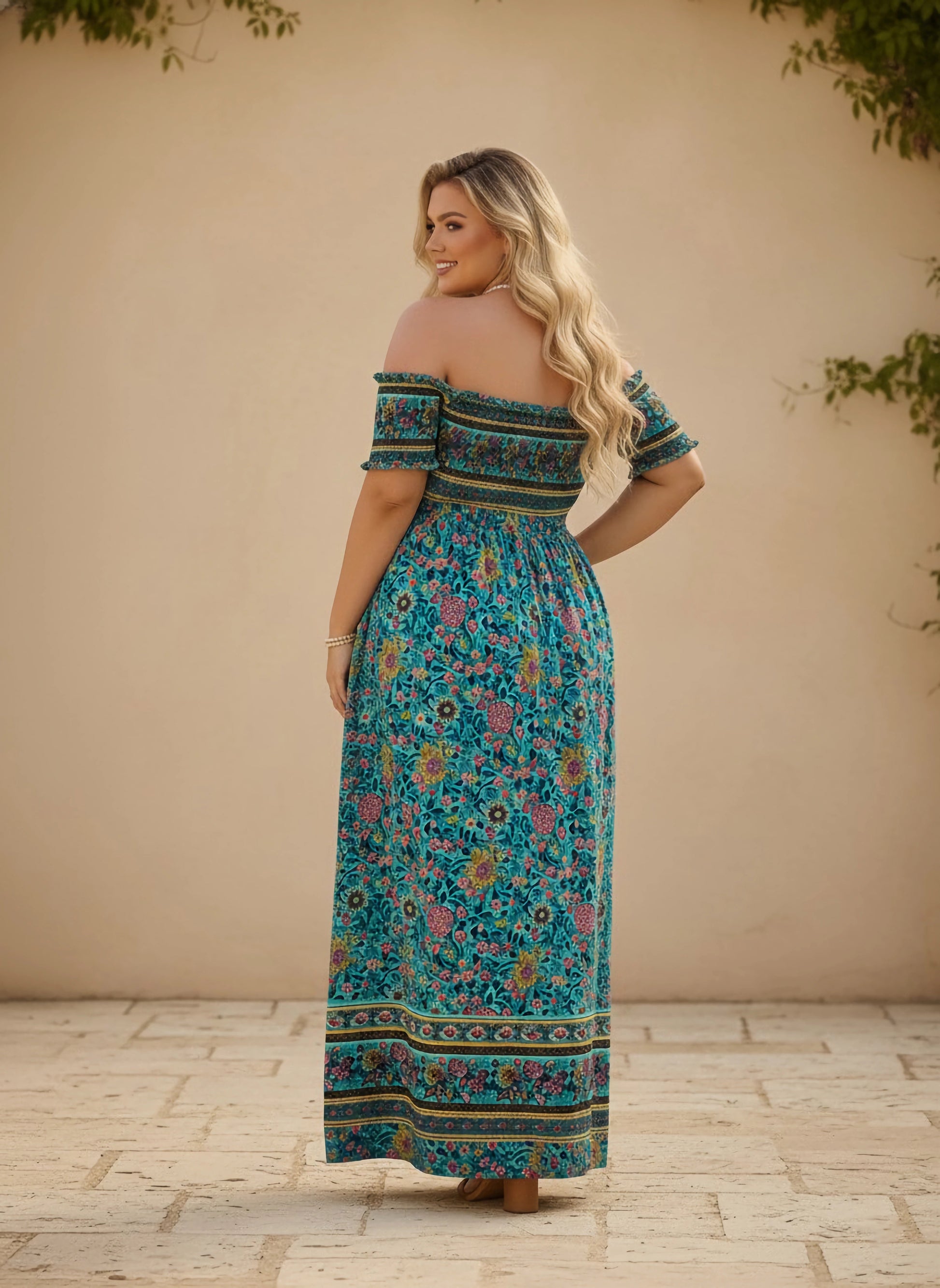 Berrylush Curve Women Blue & Multicolour Floral Printed Off-Shoulder Neck Frill Sleeves Thigh-High Slit Smocked A-Line Maxi Dress