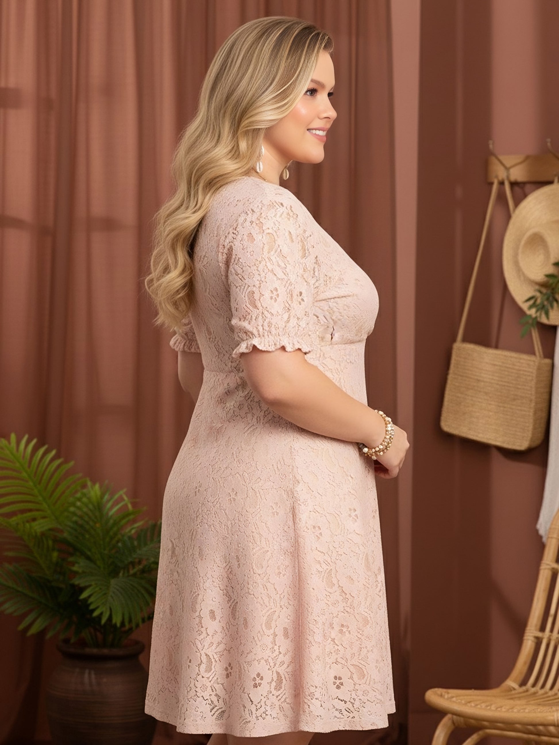 Berrylush Curve Women Pink Surplice Neck Puff Sleeve Lace Dress