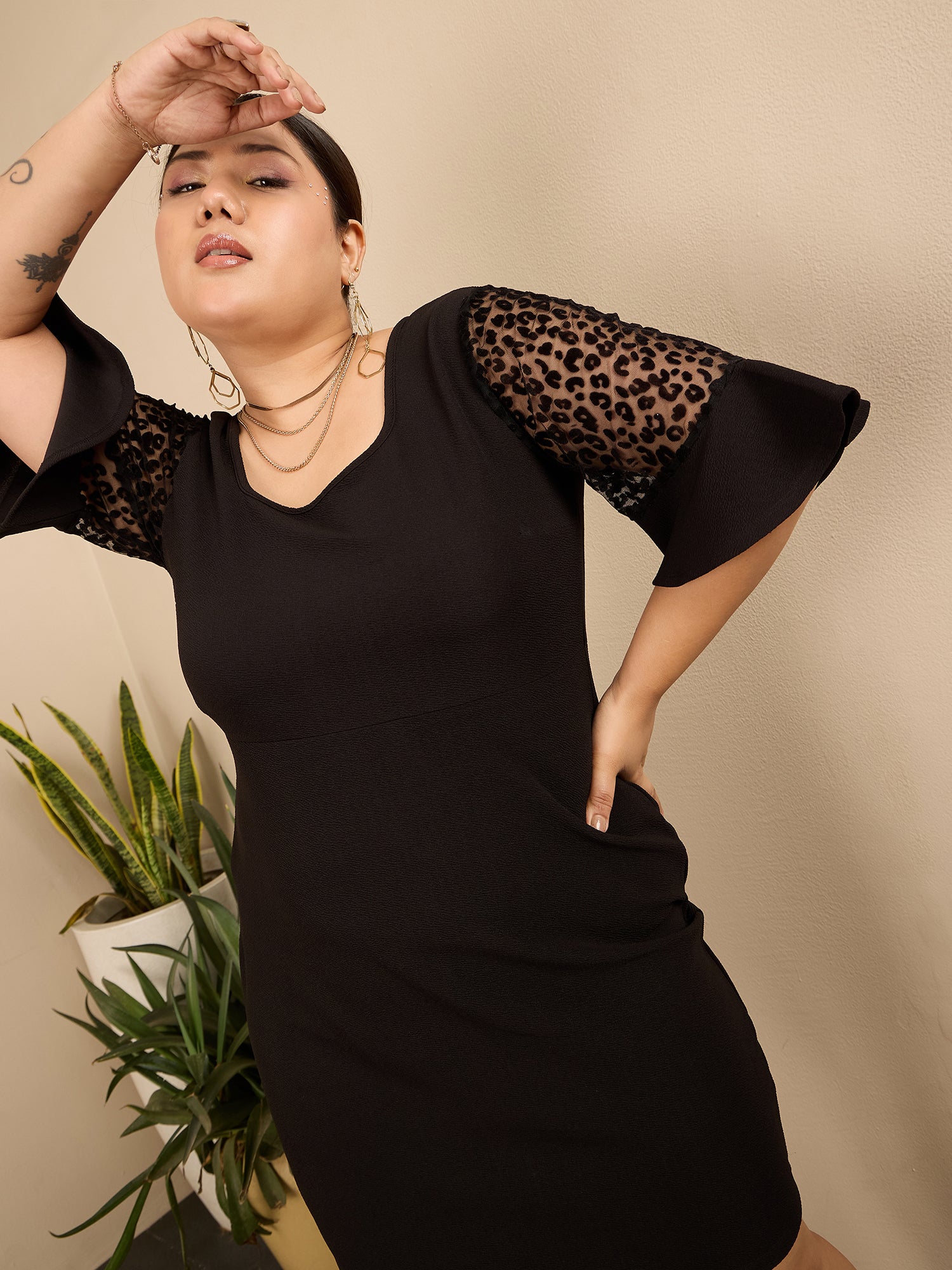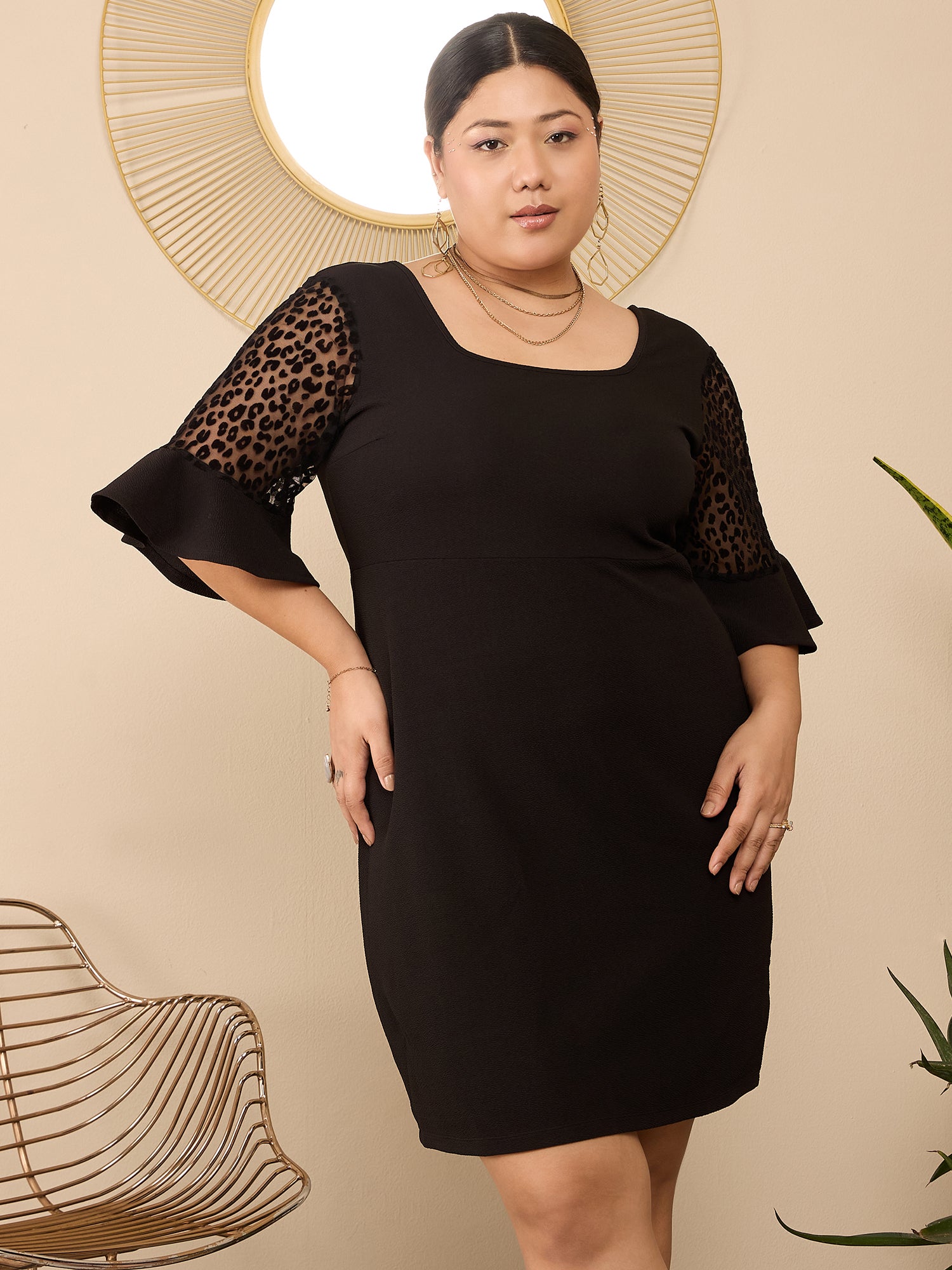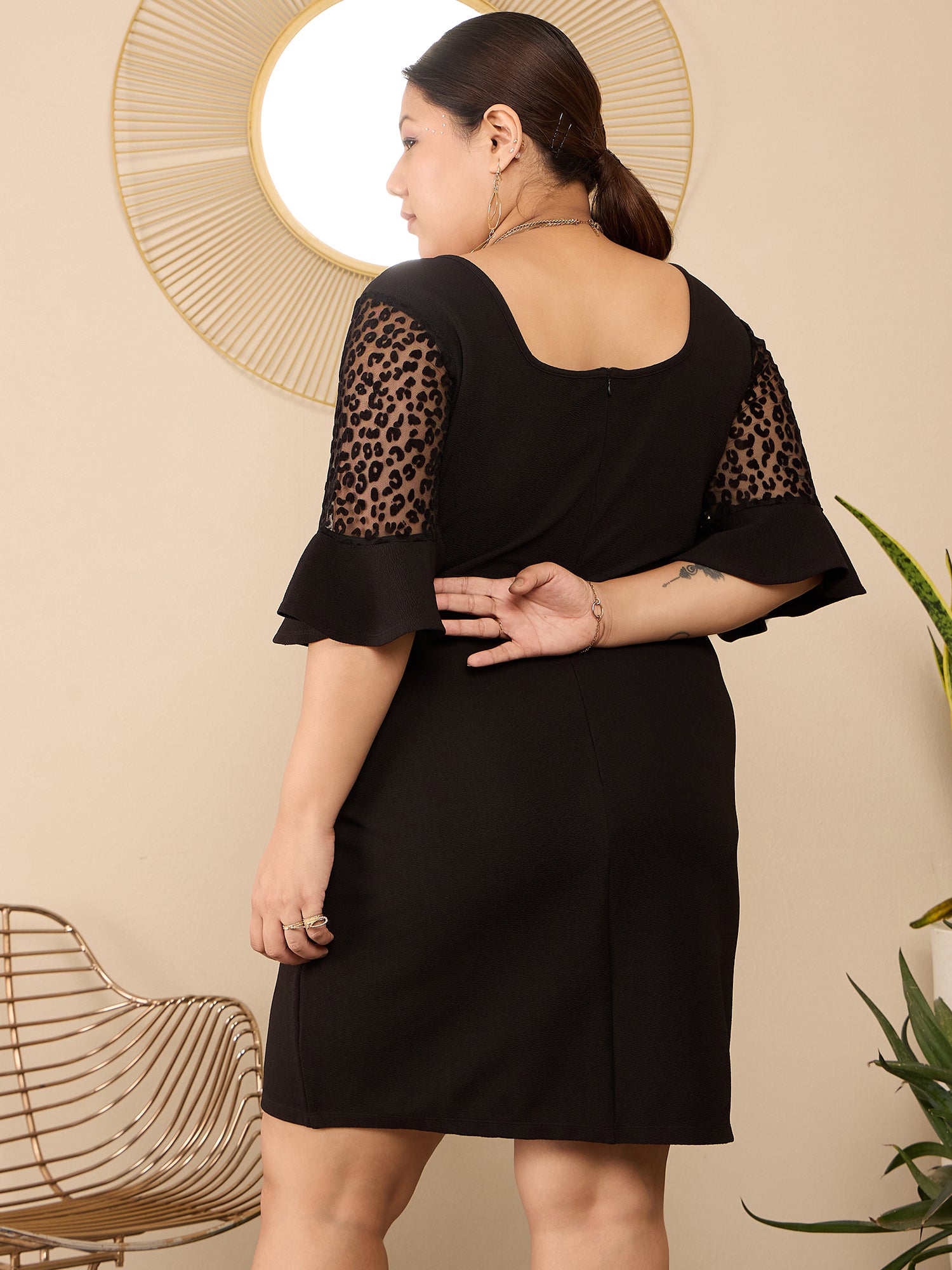 Berrylush Curve Women Solid Black Square Neck Animal-Pattern Sheer Bell Sleeves Straight Hem Ruffled Bodycon Midi Dress