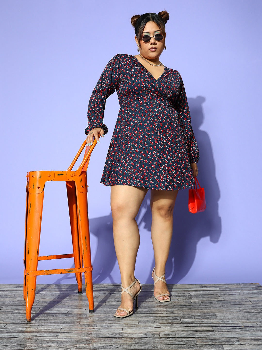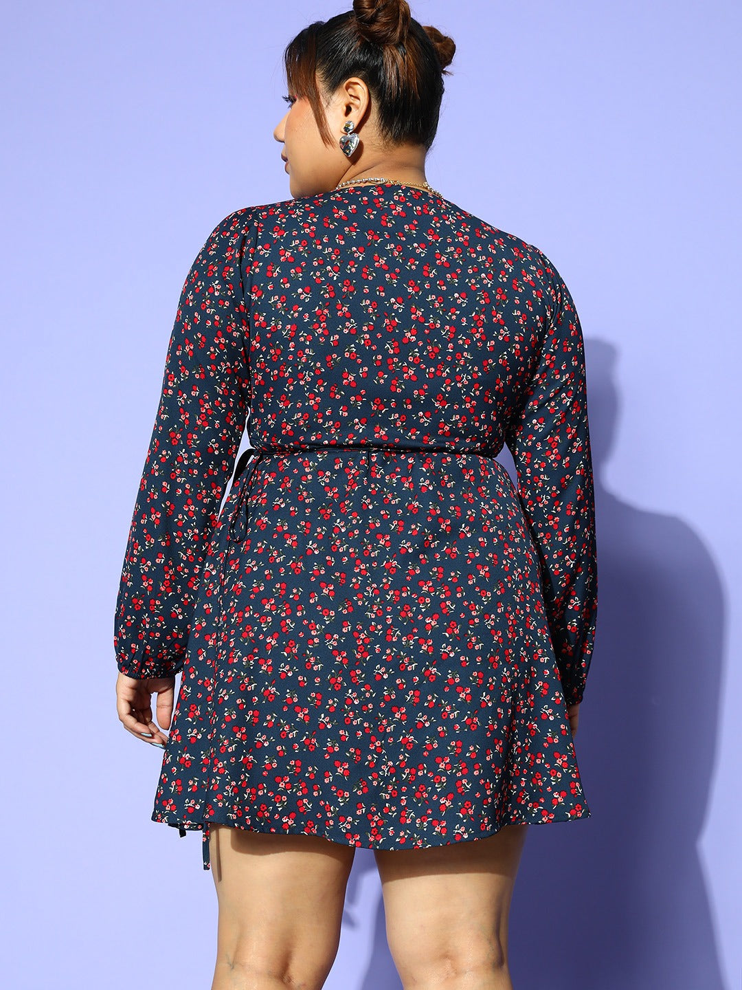 Berrylush Women Plus Size Navy Blue & Red Floral Printed V-Neck Waist Tie-Up Fit & Flare Wrap Mini Dress