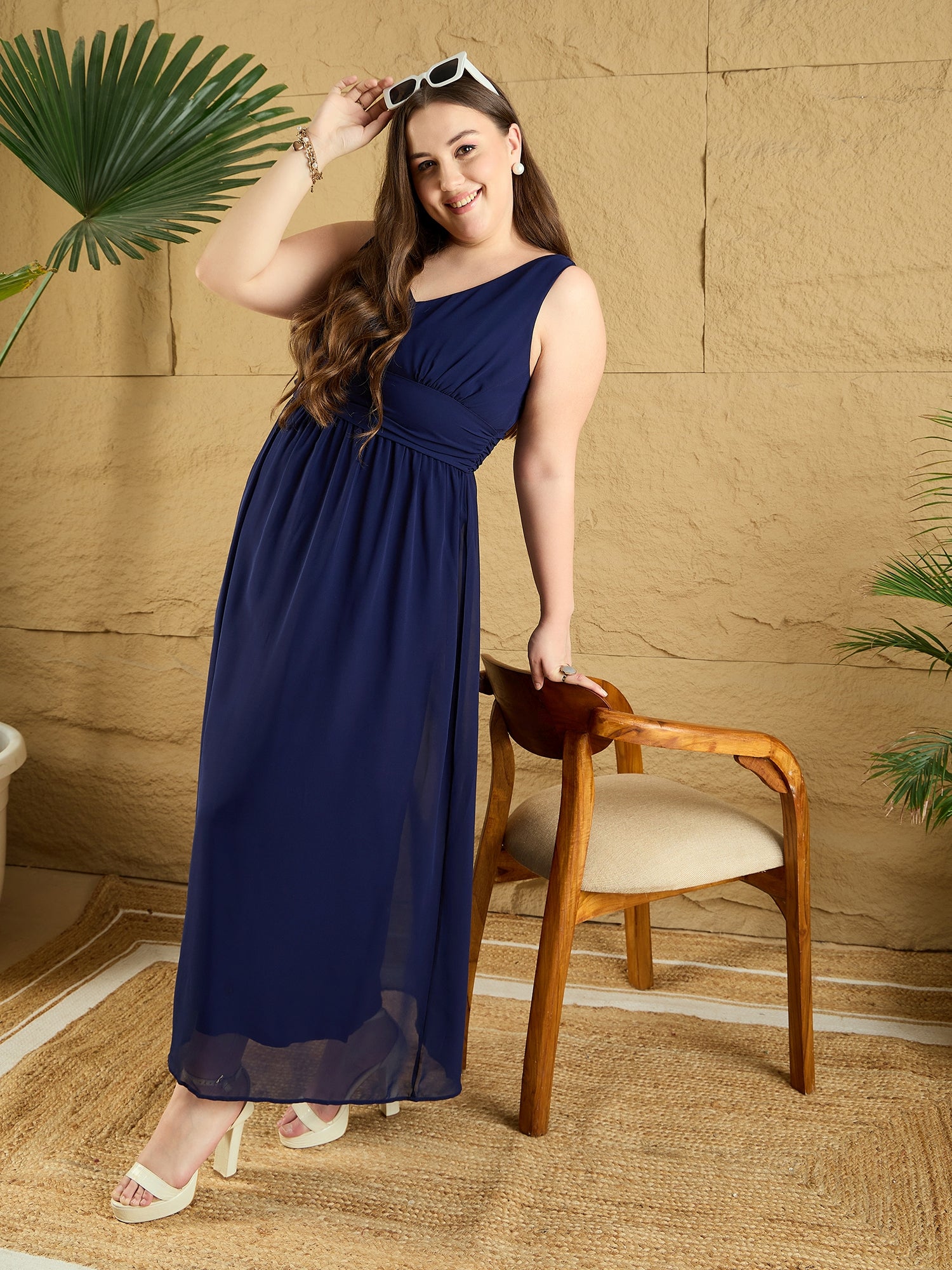 Berrylush Curve Women Solid Navy Blue V-Neck Sleeveless Back Concealed Zipper-Up Pleated A-Line Maxi Dress