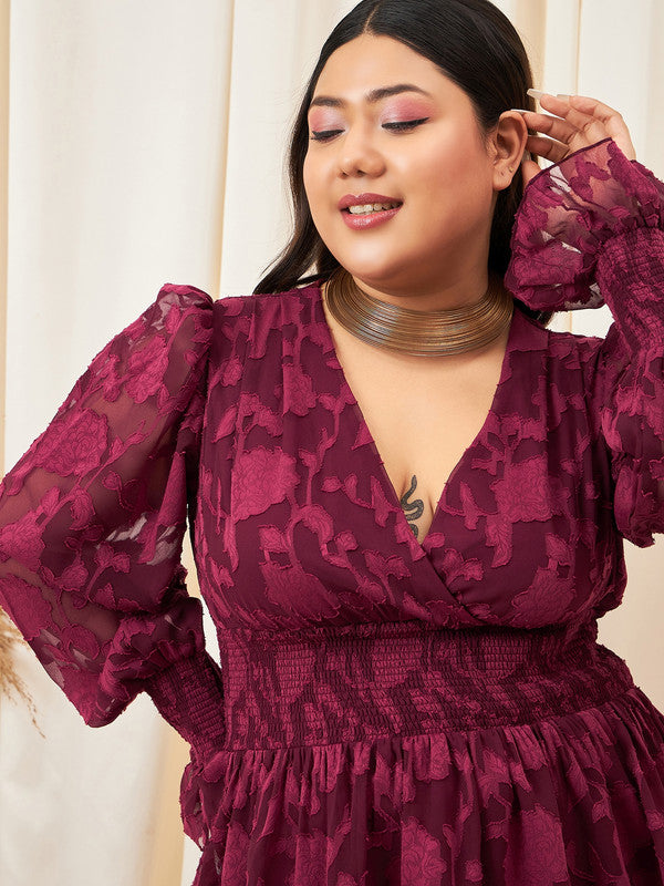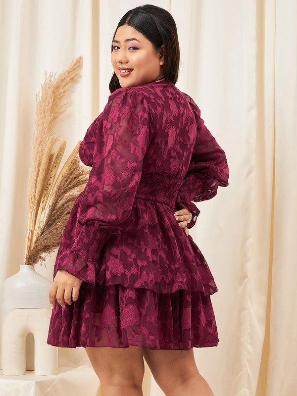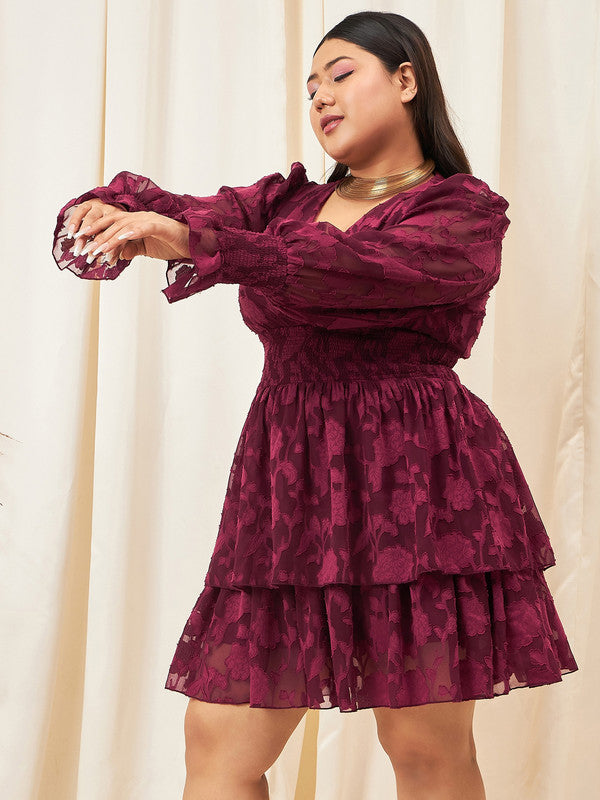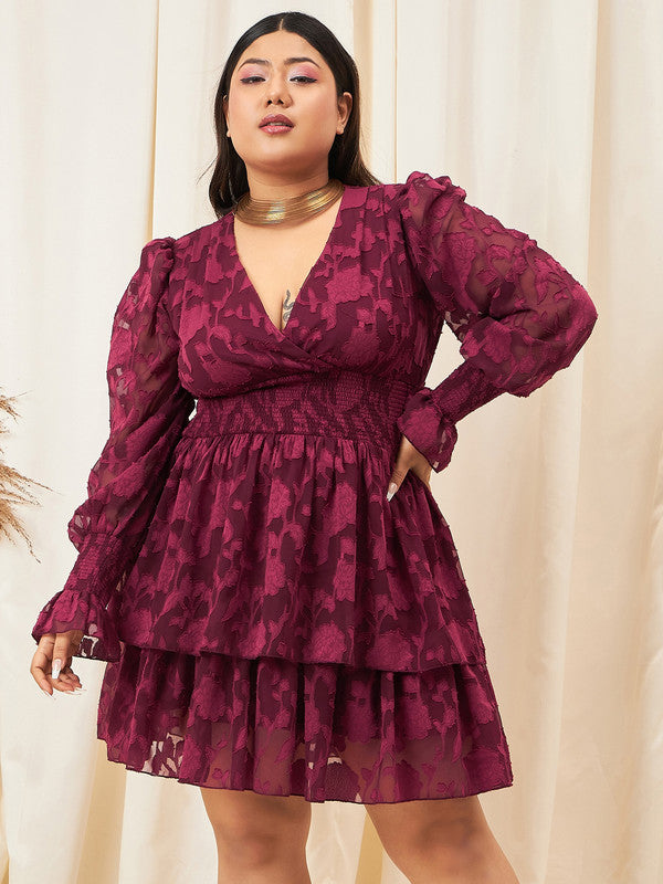 Berrylush Curve Women Maroon Floral Printed V-Neck Puff Sleeves Smocked Waist Wrap Layered Mini Dress