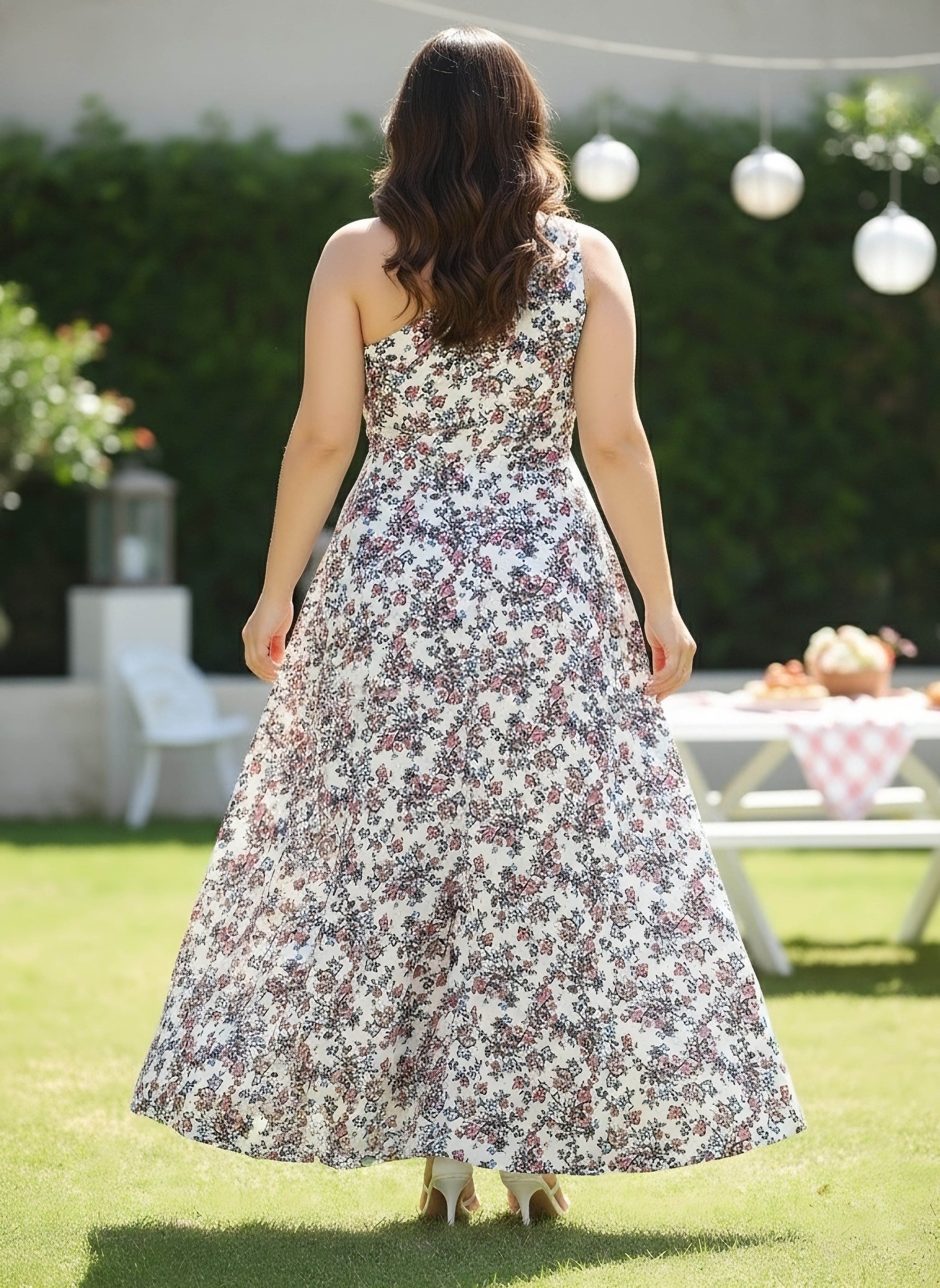 Berrylush Women Plus Size White Floral Printed One-Shoulder Neck Thigh-High Slit Flared Maxi Dress