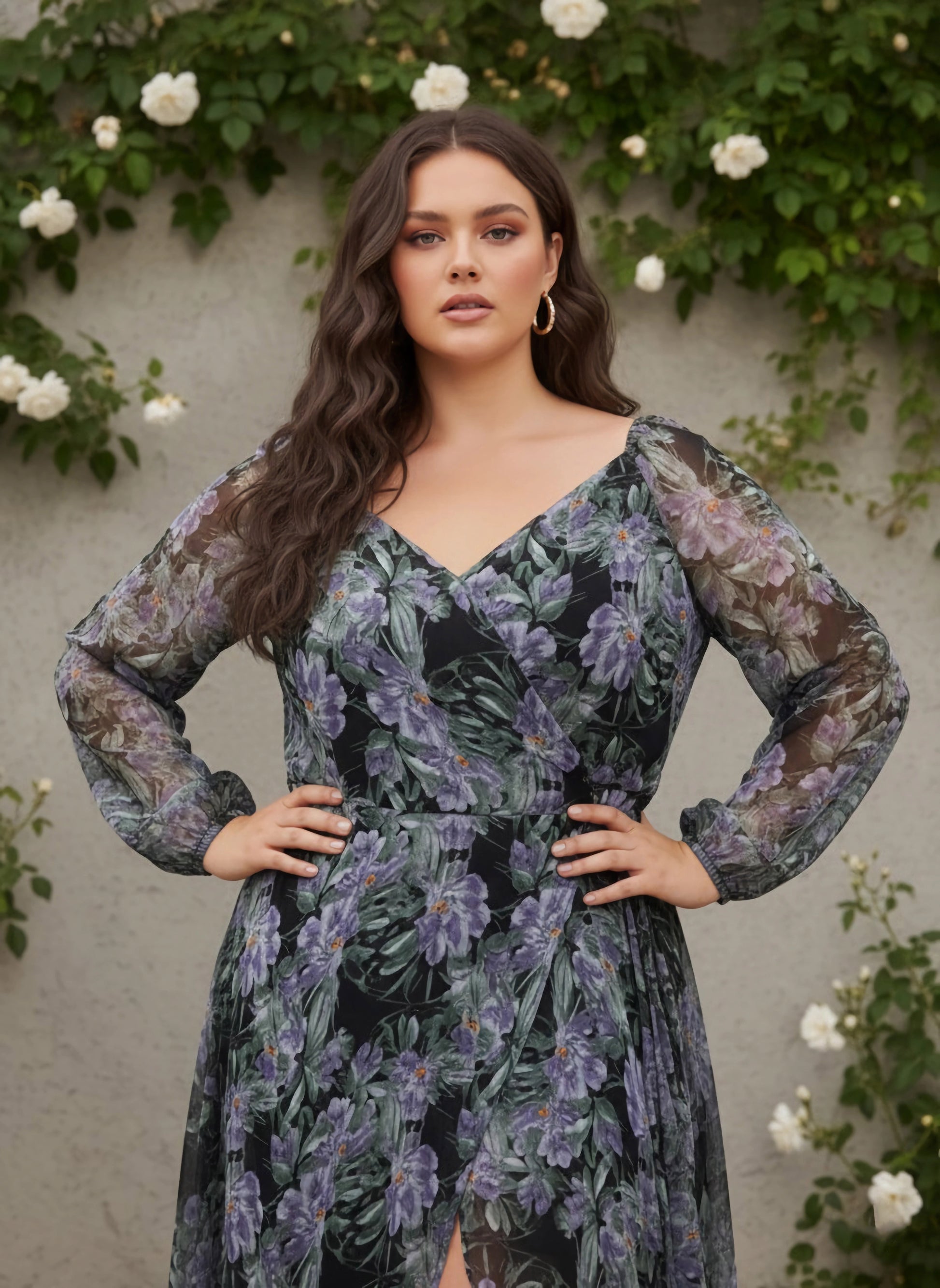Berrylush Women Plus Size Black, Blue, & Green Floral Printed Sweetheart Neck Waist Tie-Up Georgette Pleated Wrap Maxi Dress