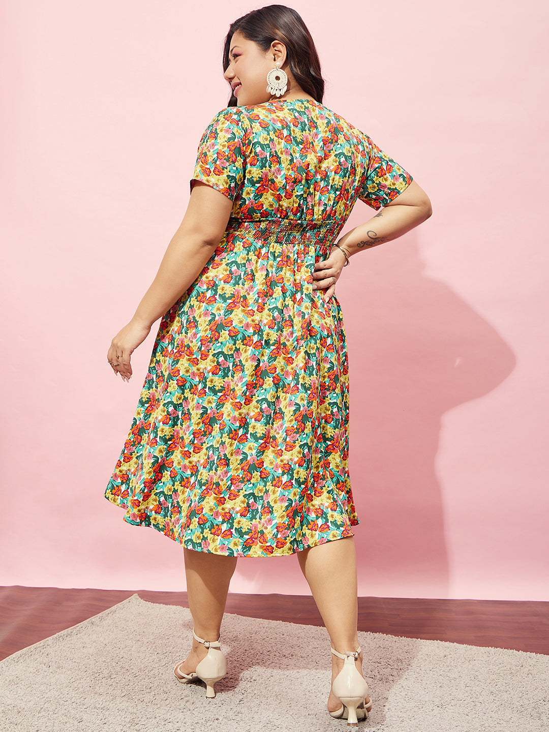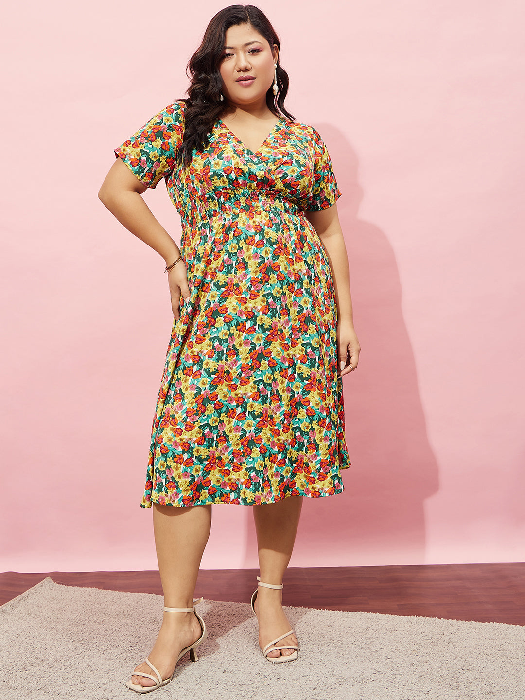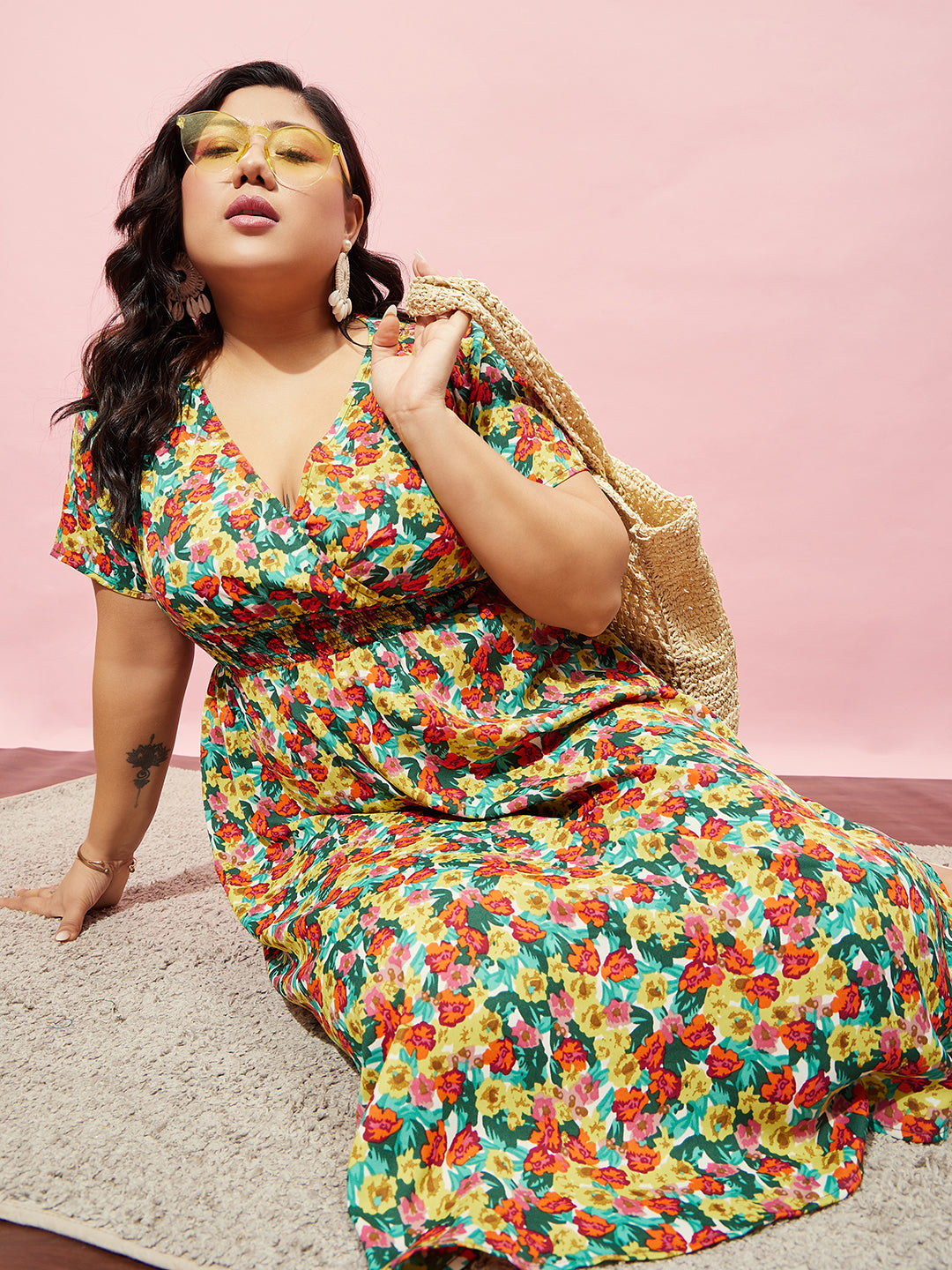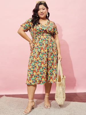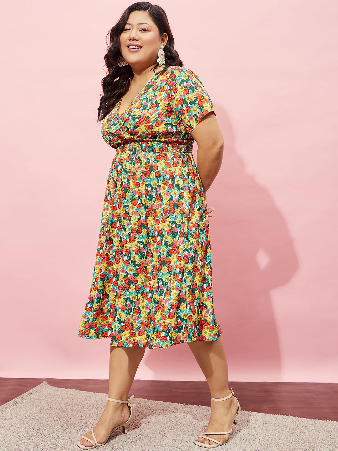 Berrylush Women Plus Size Red, Yellow, & Green Floral Printed V-Neck Crepe Flared Wrap Midi Dress