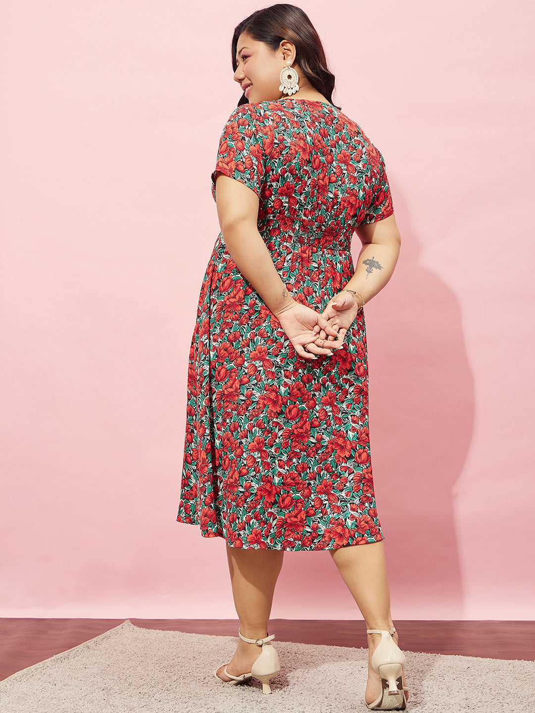 - Red and green floral print of this dress presents your bold personality