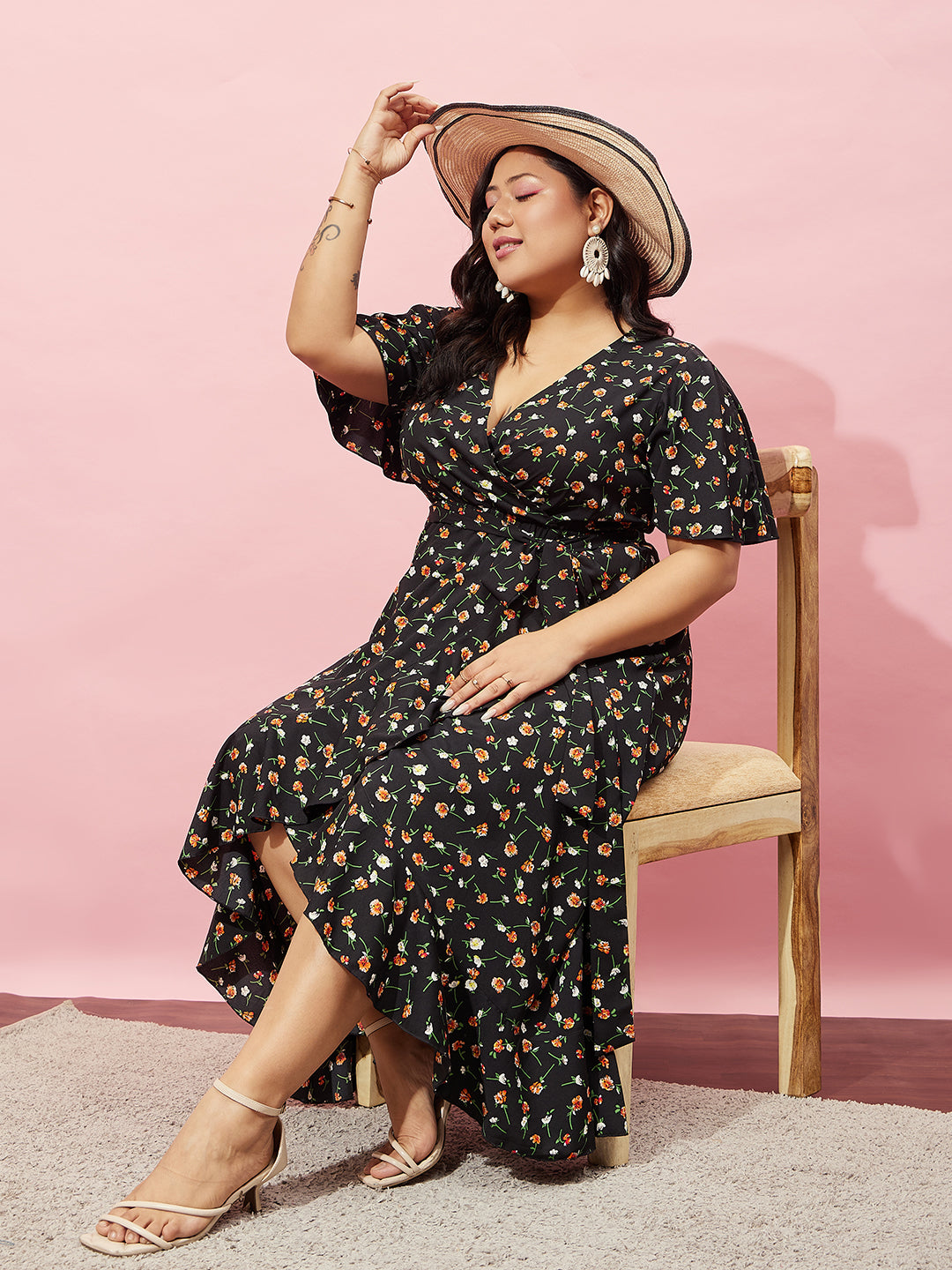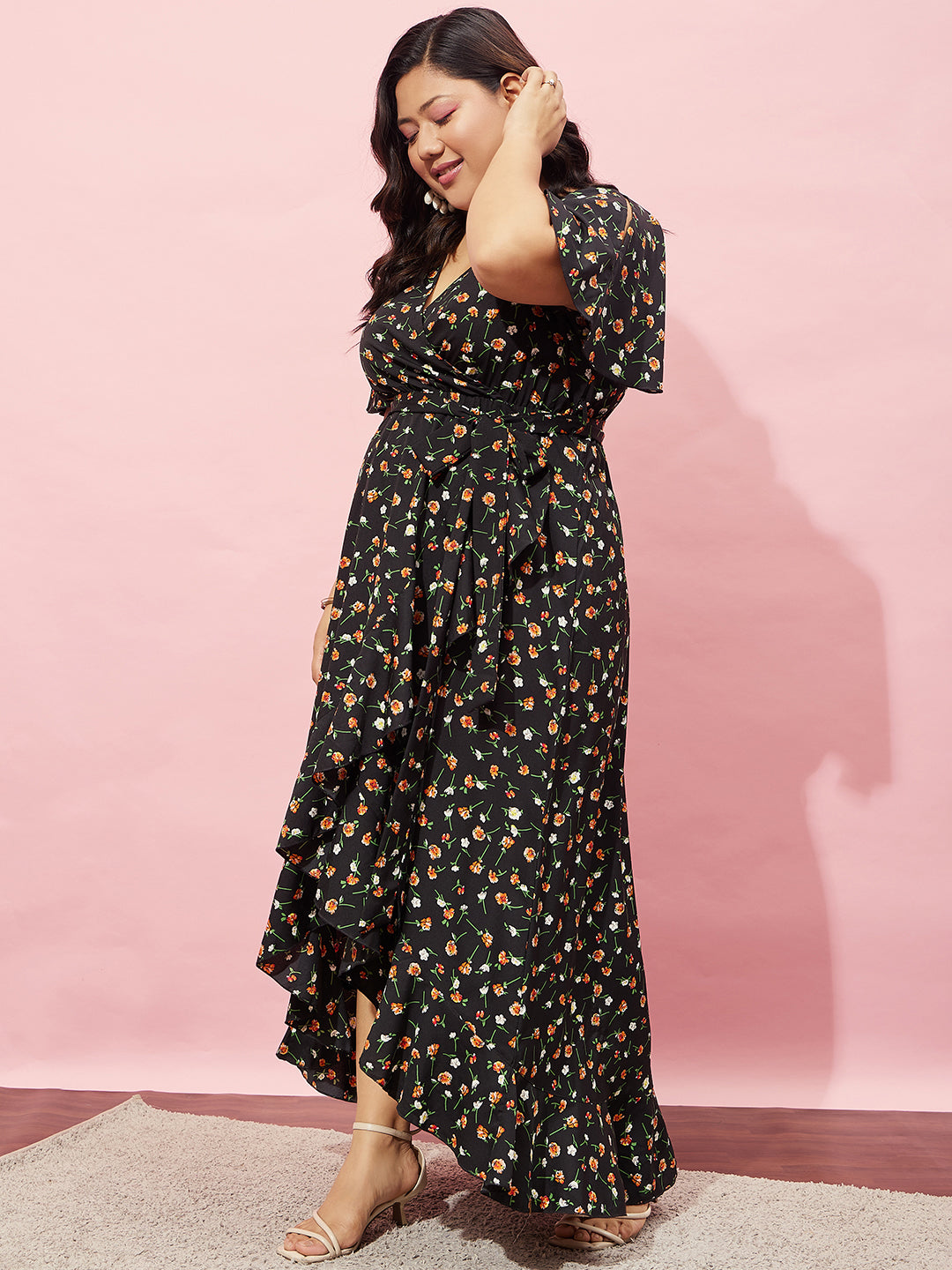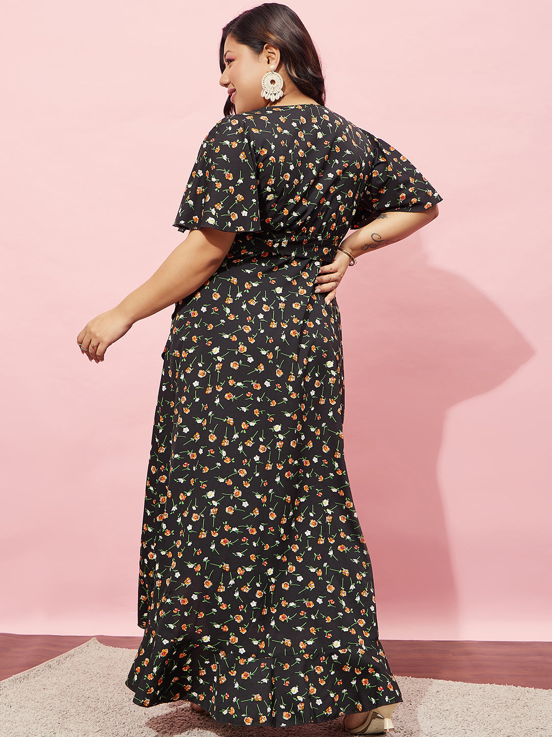 Berrylush Women Plus Size Black & Orange Floral Printed V-Neck Waist Tie-Up Crepe Flounce Hem Wrap Maxi Dress