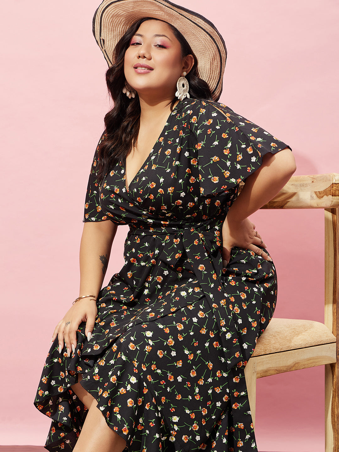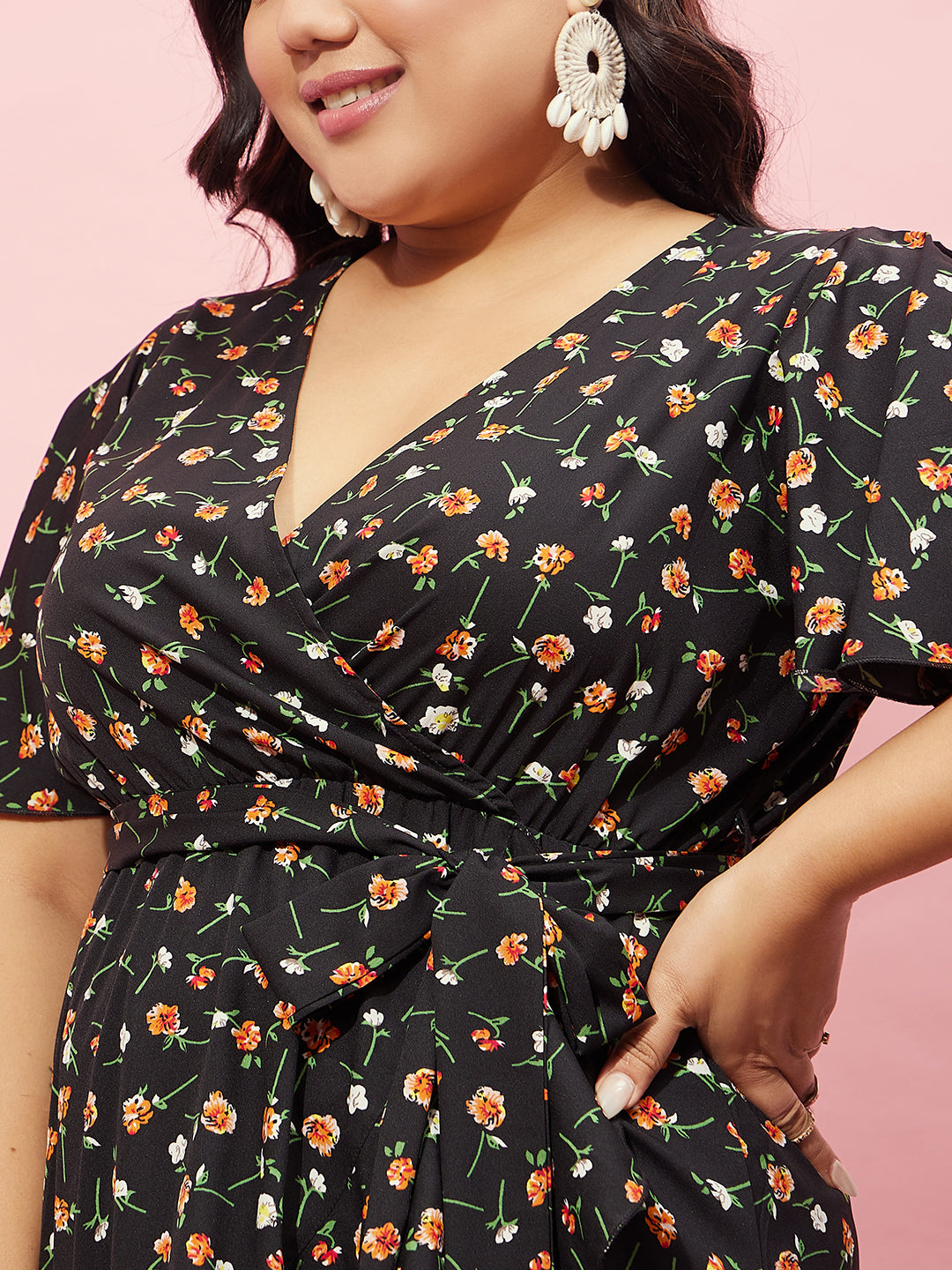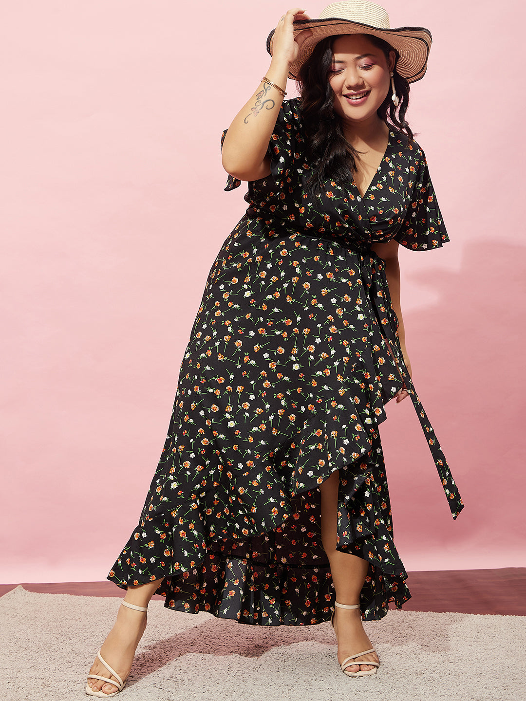 Berrylush Women Plus Size Black & Orange Floral Printed V-Neck Waist Tie-Up Crepe Flounce Hem Wrap Maxi Dress