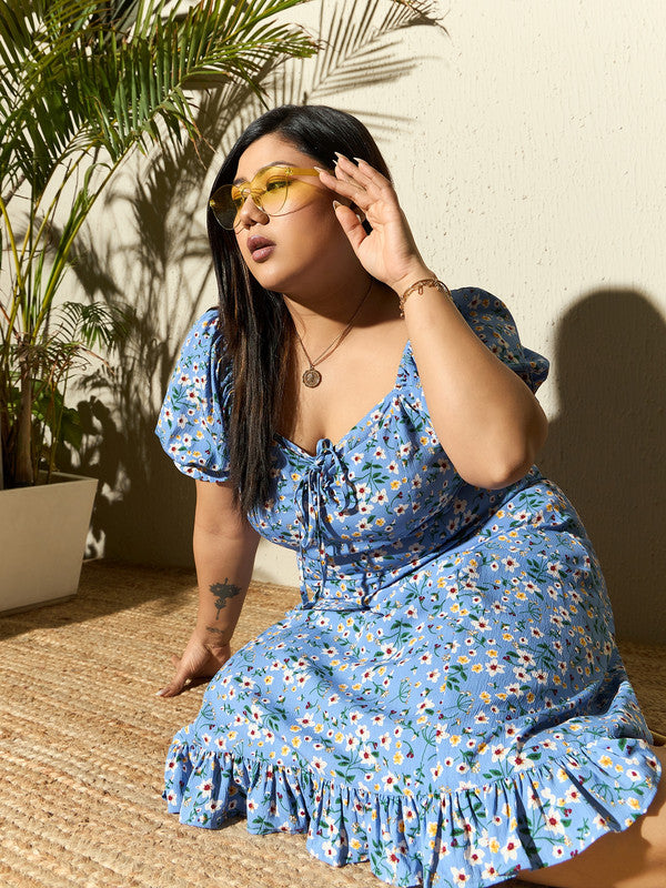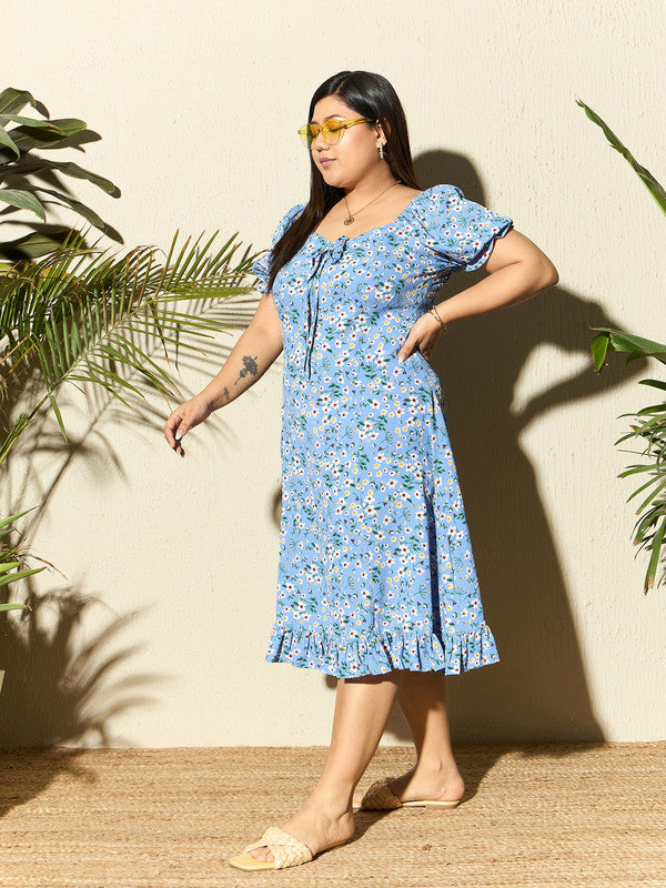 Berrylush Curve Women Blue & White Floral Printed Sweetheart Neck Front Tie-Up Flounce Hem A-Line Midi Dress