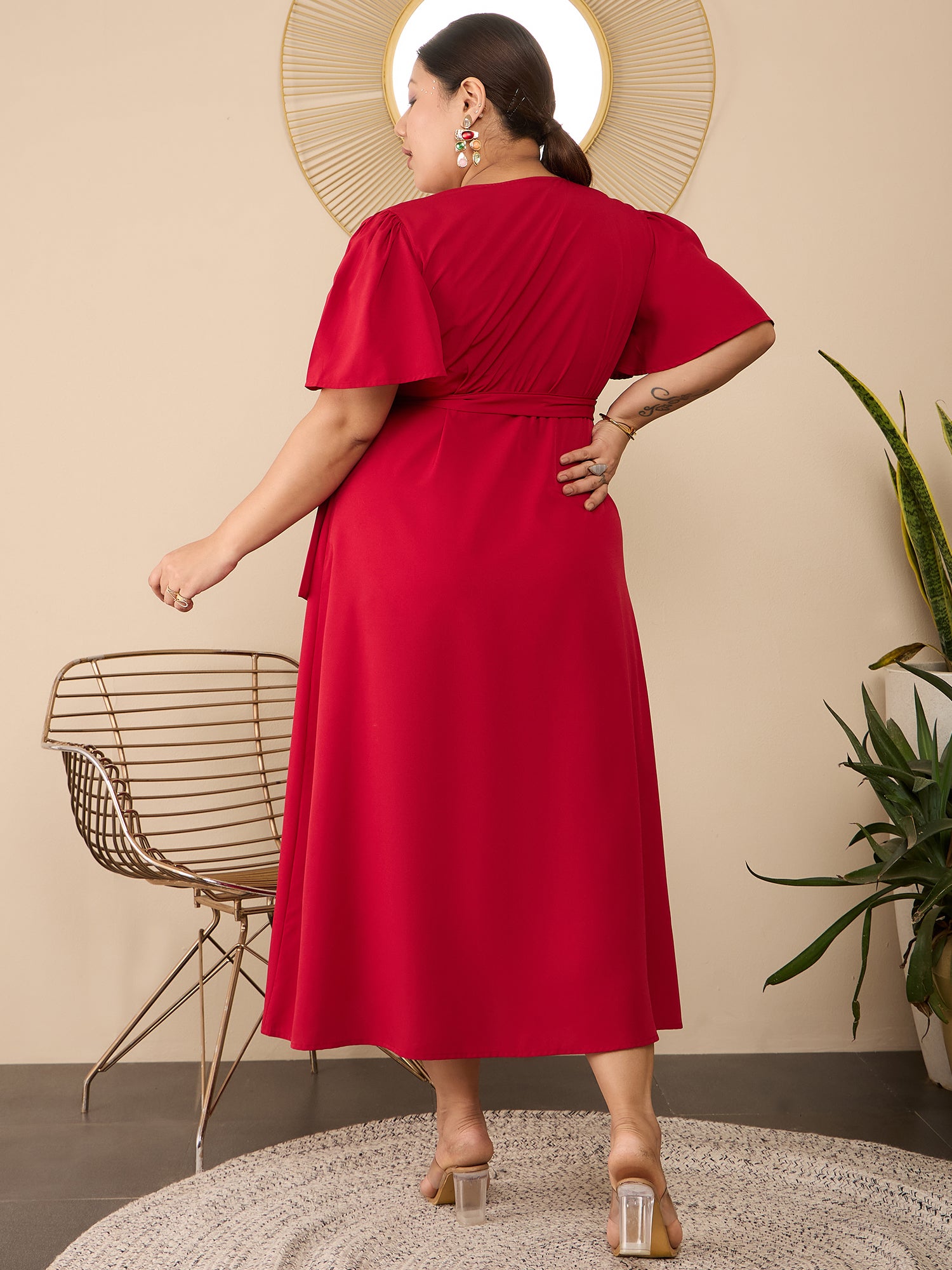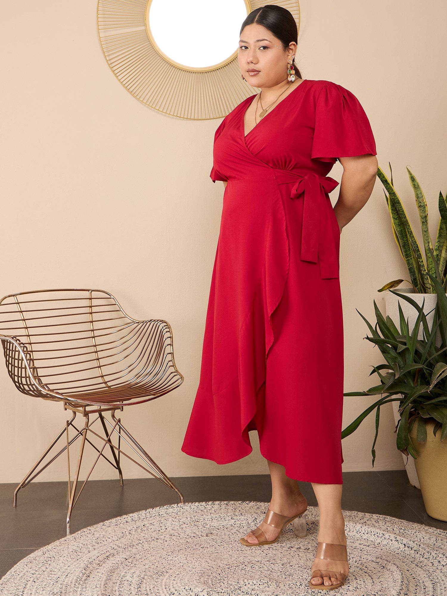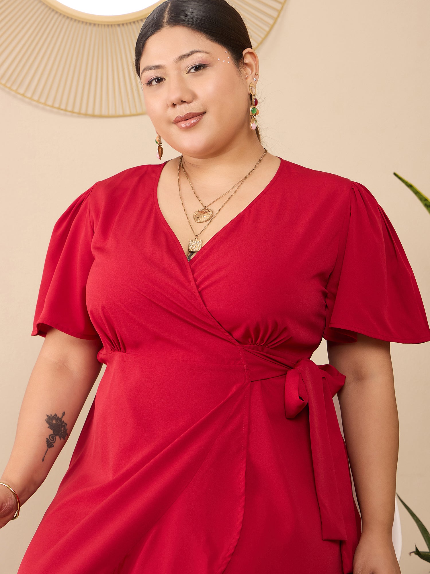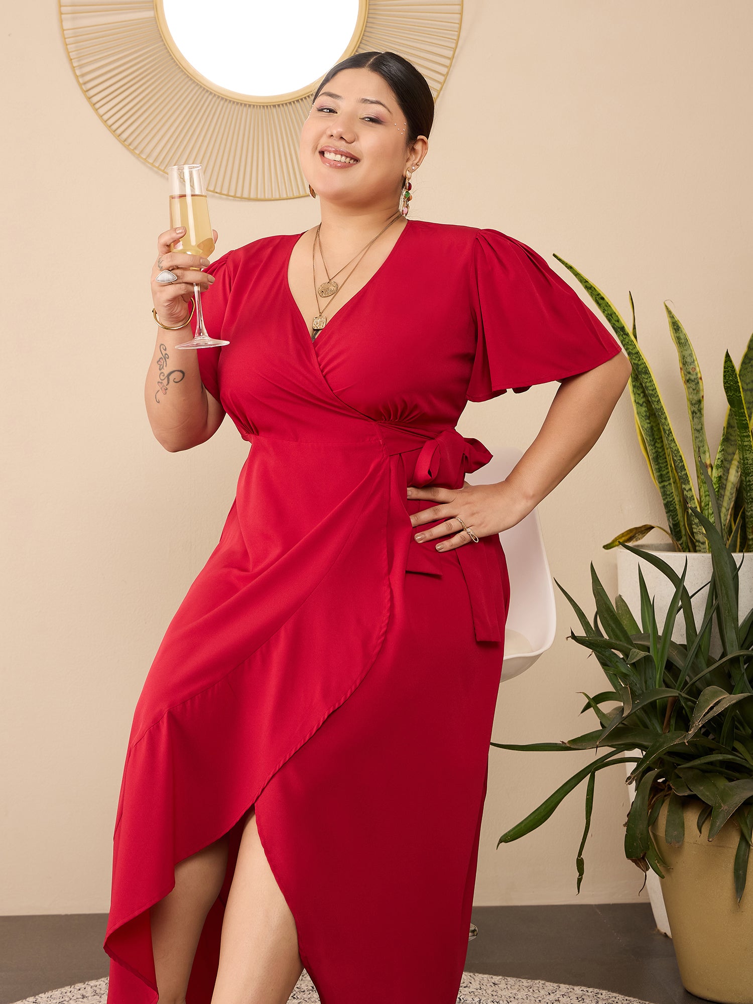 Berrylush Curve Women Solid Red V-Neck Flared Sleeves Tie-Up Waist Asymmetrical Hem Wrap Ruffled Maxi Dress