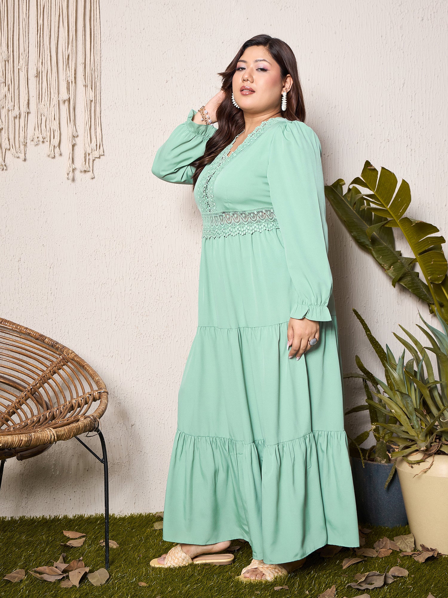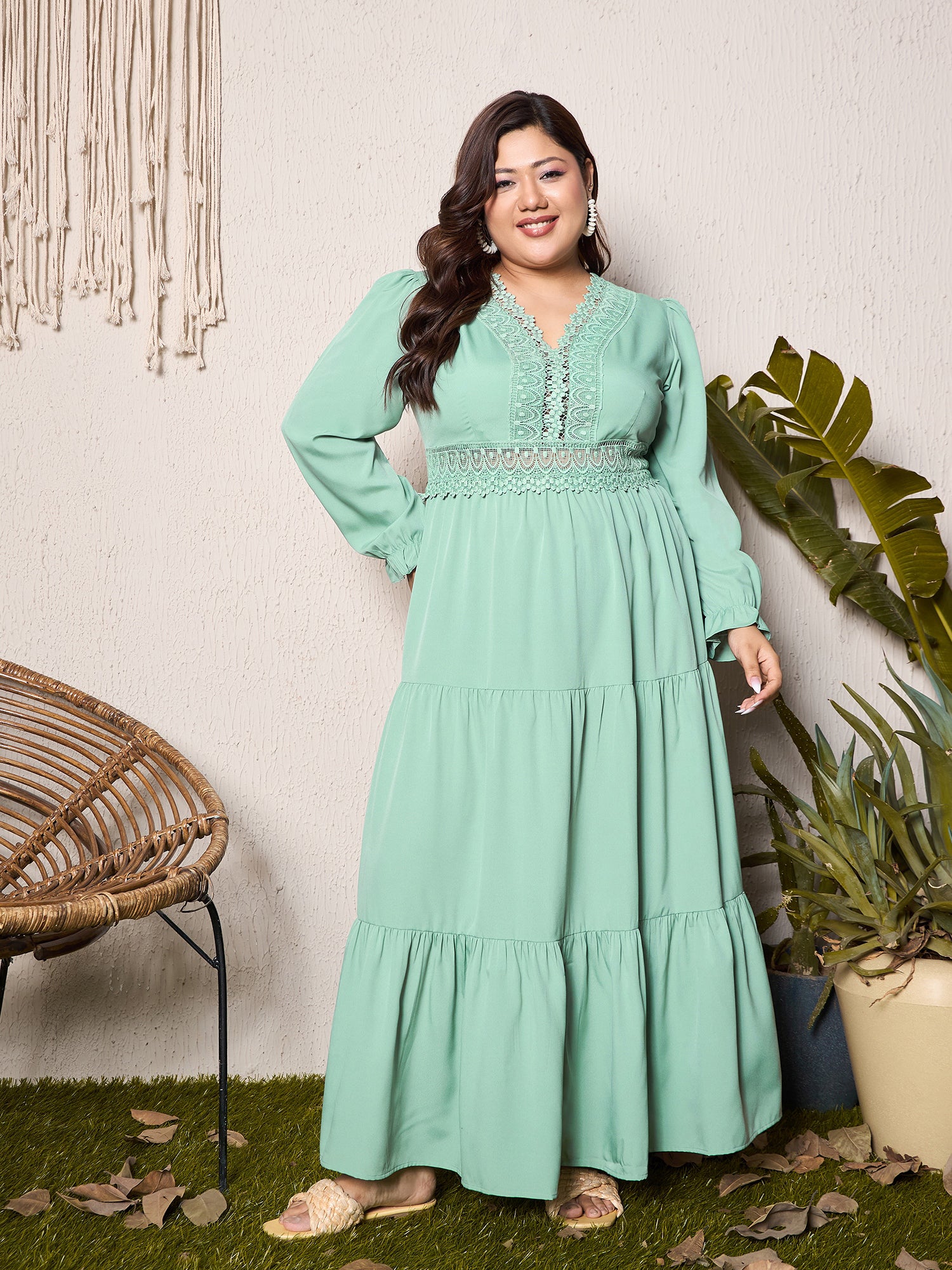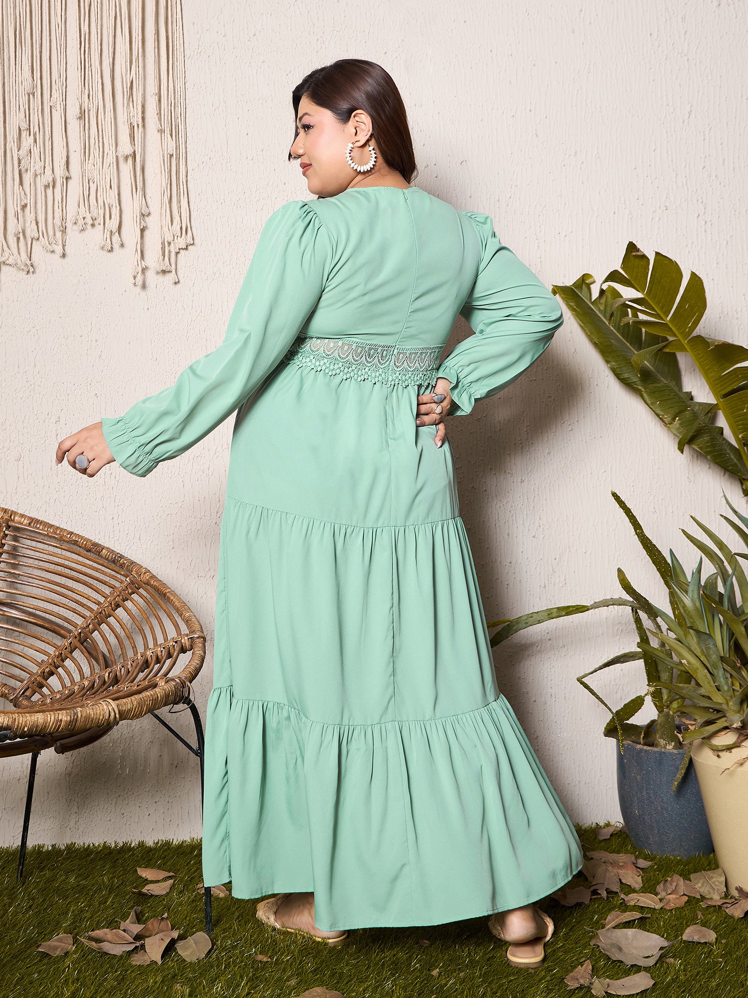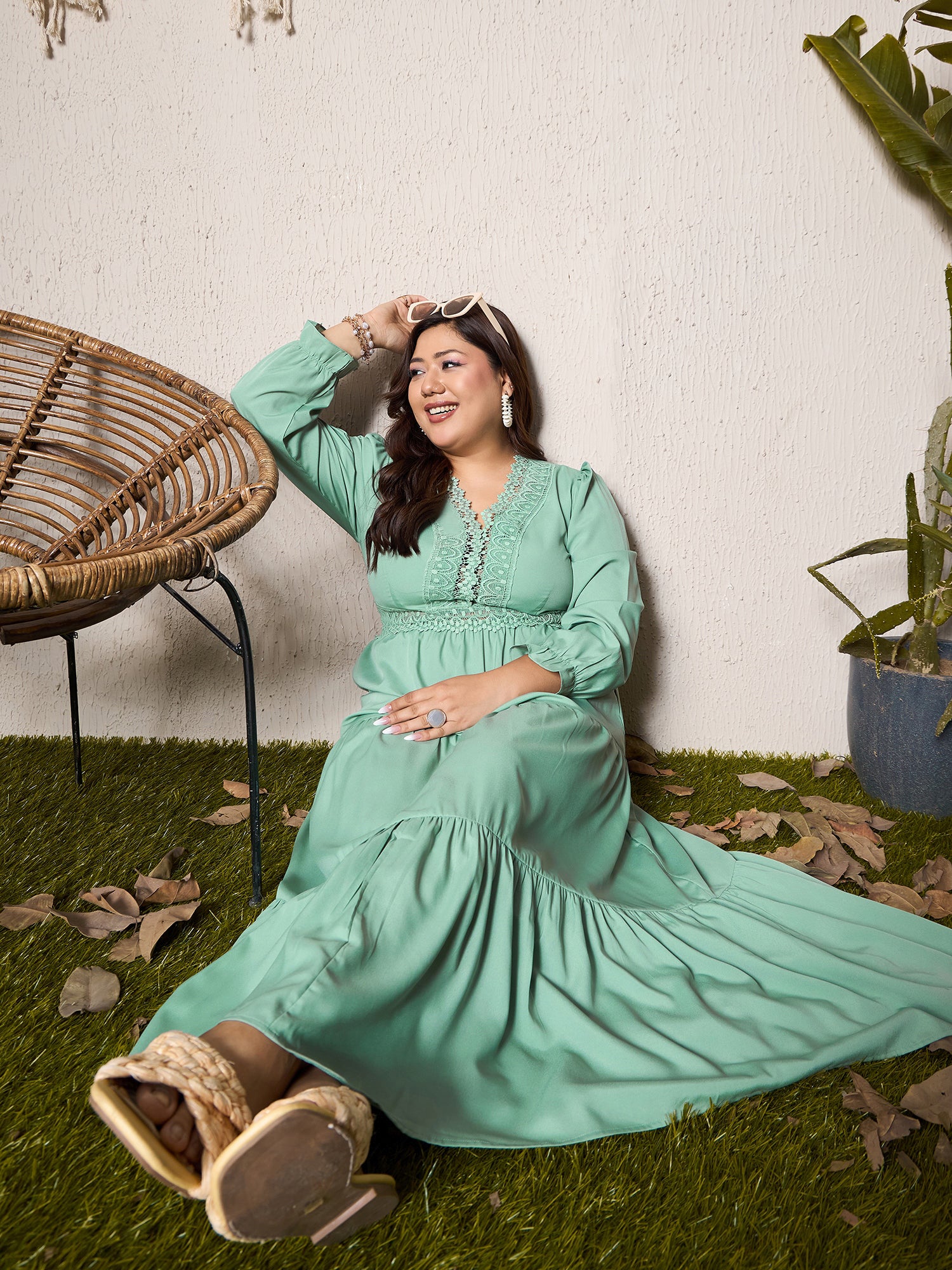 Berrylush Curve Women Solid Green V-Neck Bishop Sleeves Lace Detail Gathered Maxi Dress