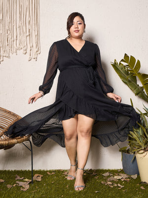 Berrylush Curve Women Solid Black Dobby Weave V-Neck Puff Sleeves Tie-Up Waist Tulip Hem Wrap Ruffled Midi Dress