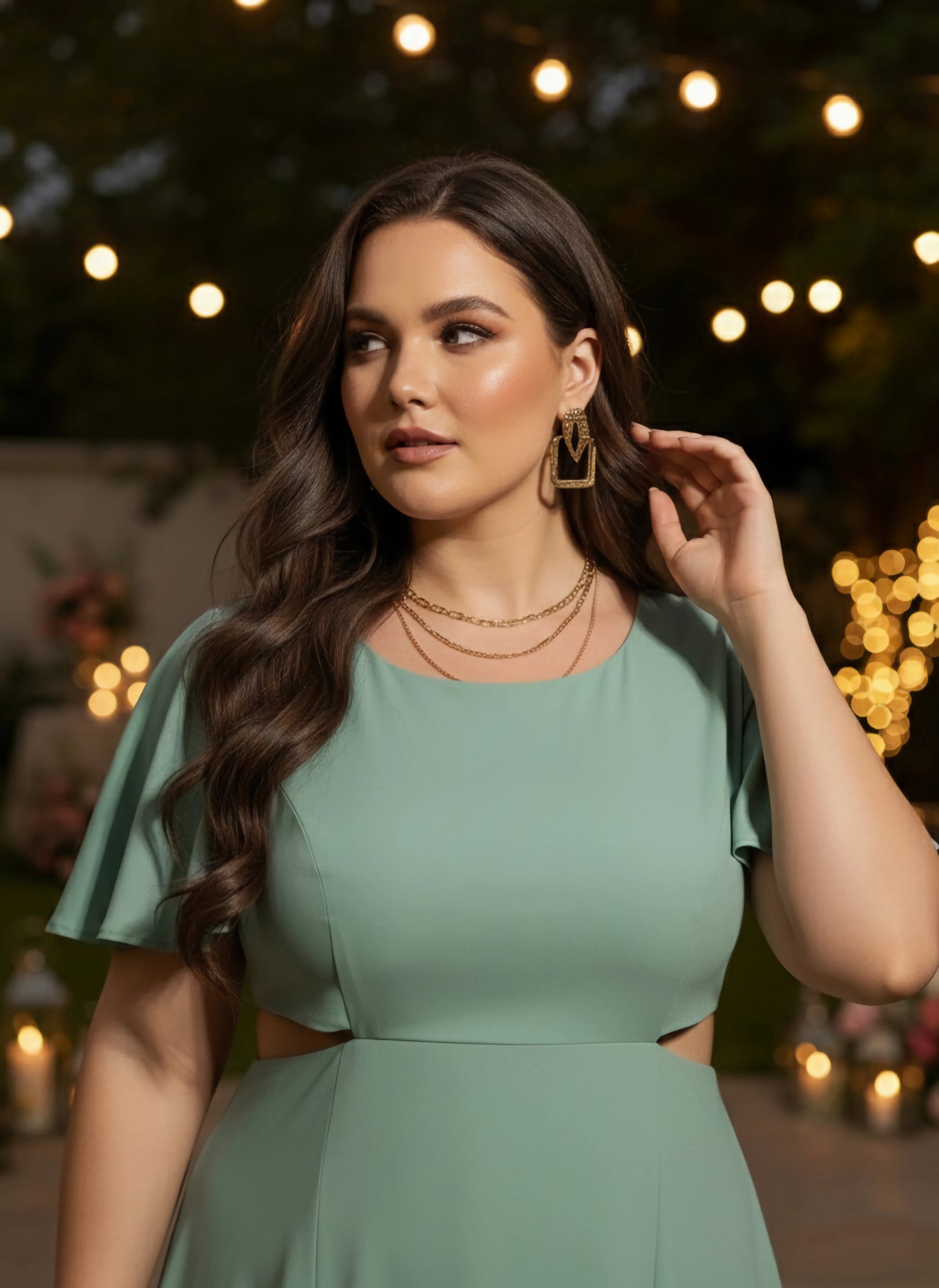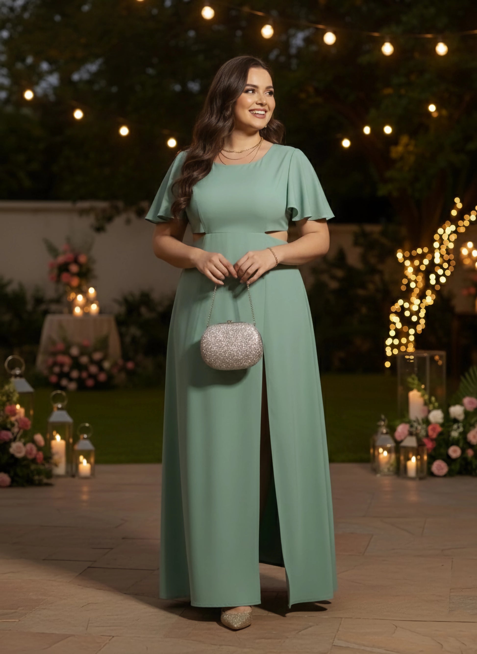 Introducing the latest in casual elegance from Berrylush Curve: the Solid Green Maxi Dress. This beautifully designed piece features a classy round neckline and flared short sleeves, enhancing its breezy silhouette that flares gracefully at the hemline. Crafted in soft, woven polyester for comfort and lasting wear, it boasts striking waist cutouts and a thigh-high slit that add a daring touch of allure to your ensemble. The solid green colour exudes freshness while remaining versatile for any casual setting—made secure with an easy-zip closure to ensure a flawless fit every time. Step into effortless style with this impeccable dress perfect for days you want to stand out effortlessly!