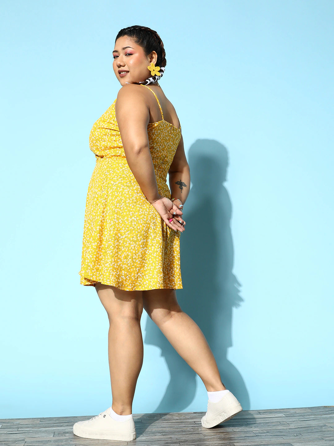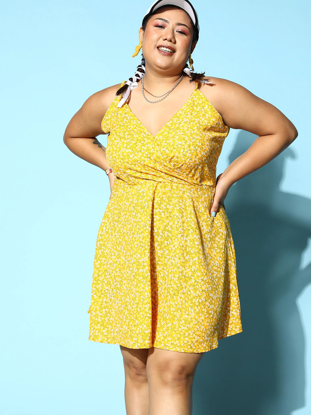 Berrylush Women Plus Size Yellow & White Floral Printed V-Neck Sleeveless Pleated Wrap Mini Dress