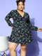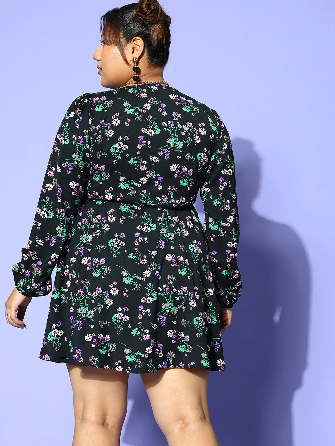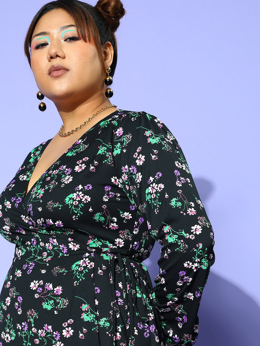 Berrylush Women Plus Size Black & Green Floral Printed V-Neck Waist Tie-Up Fit & Flare Wrap Mini Dress