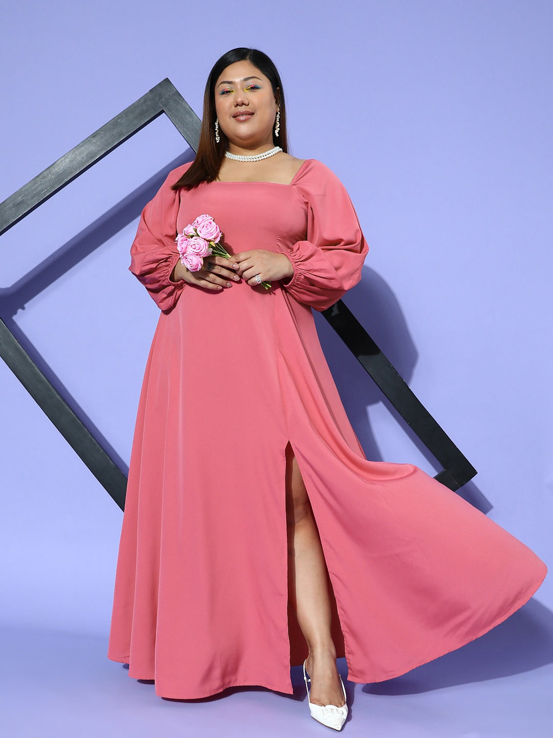 Berrylush Women Plus Size Solid Pink Square Neck Crepe Zipper-Up Thigh-High Slit Fit & Flare Maxi Dress