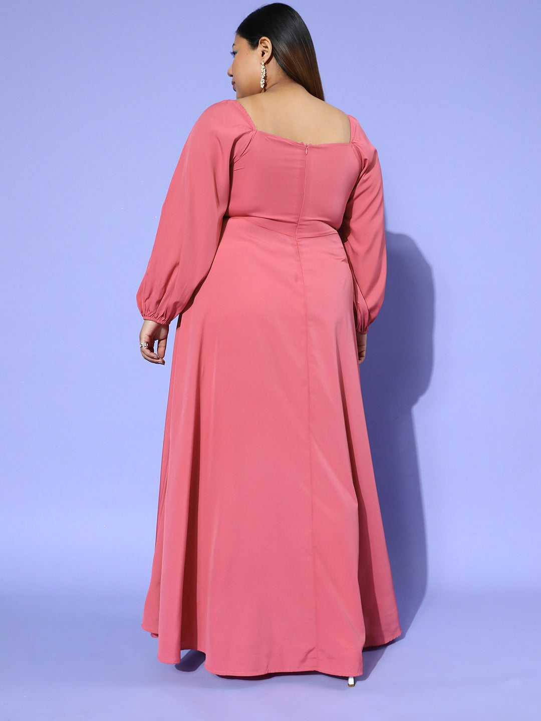 Get the perfect blend of edginess and elegance for your party wear collection by wearing this charming Solid Pink Square Neck Crepe Zipper-Up Thigh-High Slit Fit & Flare Maxi Dress introduced by Berrylush. Styled with long-puffed sleeves that lend your beautiful arms complete coverage to keep them warm for a longer duration. Designed with crepe polyester fabric that offers this dress a luxurious sheen with a super soft feel to your body. The maxi length presents a versatile and timeless design of this dress that gives your legs proper and tantalizing closure. Be the limelight of the upcoming party events by wearing this maxi dress with a pair of silver block heels, diamond jewellery, and a trendy sling bag.