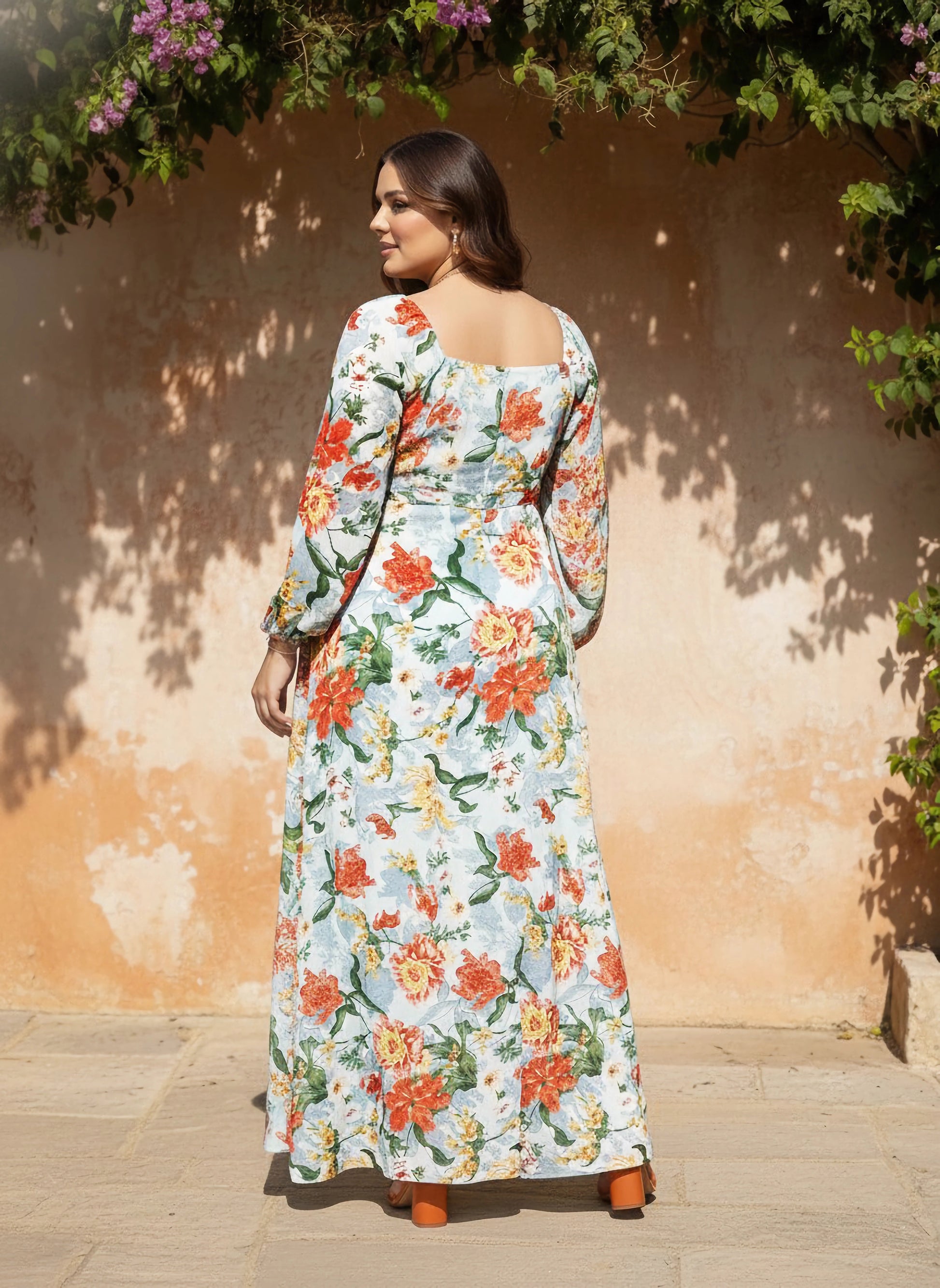 Berrylush Women Plus Size Blue & Orange Floral Printed Square Neck Georgette Thigh-High Slit Flared Maxi Dress