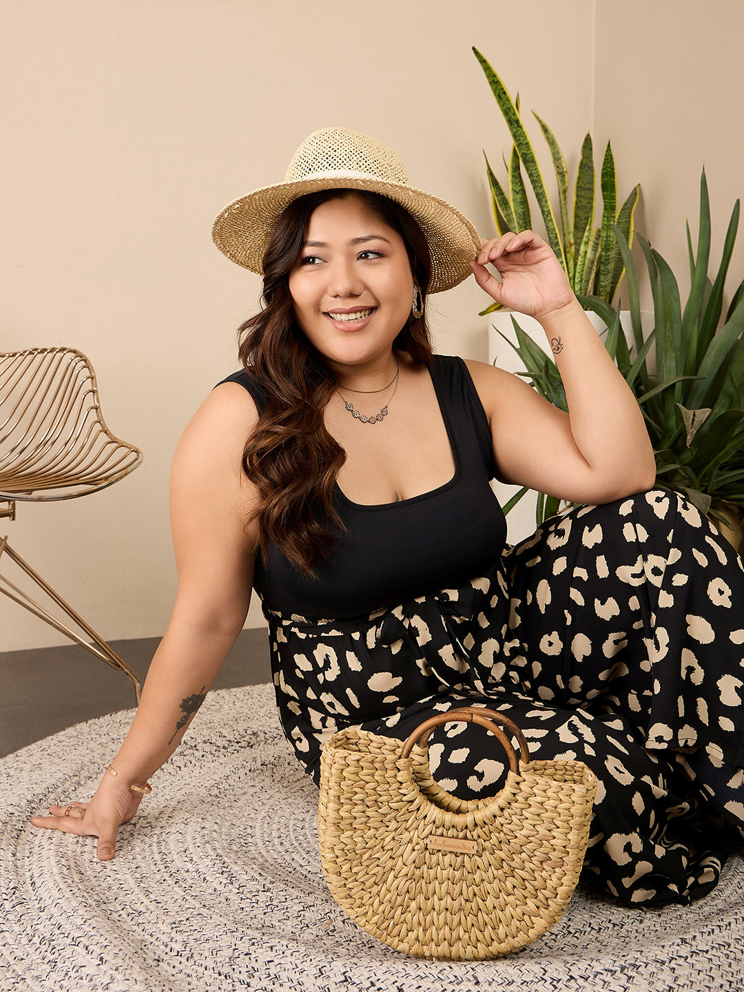 Step into effortless style with the Black & Cream Animal Printed Round Neck Sleeveless Waist Tie-Up Wide Leg Regular Jumpsuit from Berrylush Curve. This striking piece features a chic animal print that adds a trendy touch to your look, perfectly blending boldness with elegance. Crafted from soft polyester, it ensures comfort while you go about your day or enjoy an evening out. The unique round neckline and sleeveless design create a flattering silhouette, while the tie-up waist cinches in for an accentuated shape. With wide-leg pants that flow gracefully as you move, this jumpsuit is designed for those who embrace both fashion and freedom of movement. Opaque coverage means you can wear it confidently on any casual occasion - from brunch dates to relaxed outings with friends - making it a versatile staple in your wardrobe. Slip into this jumpsuit for an effortlessly stylish look every time!