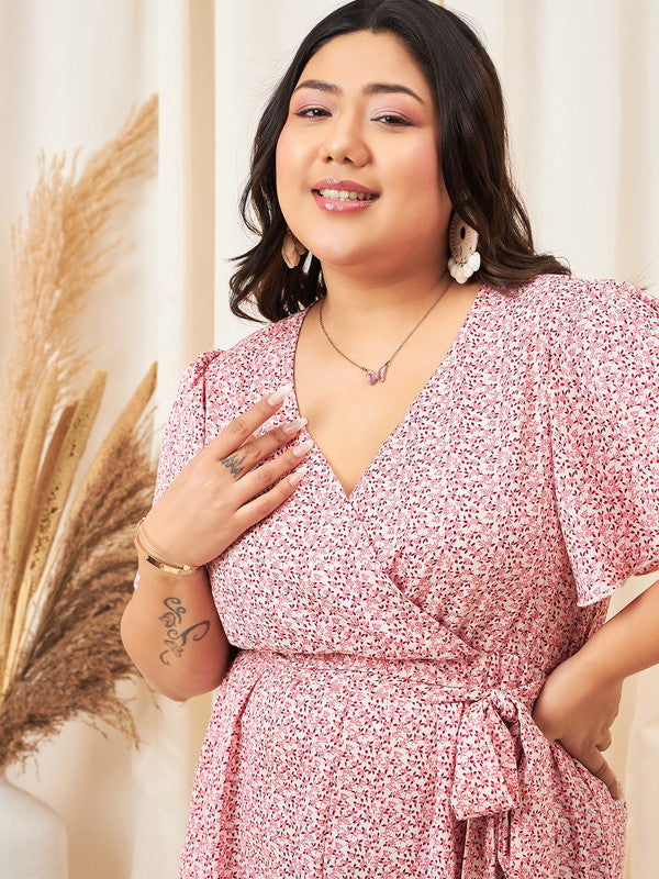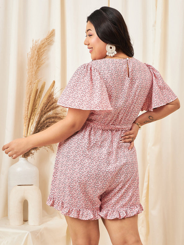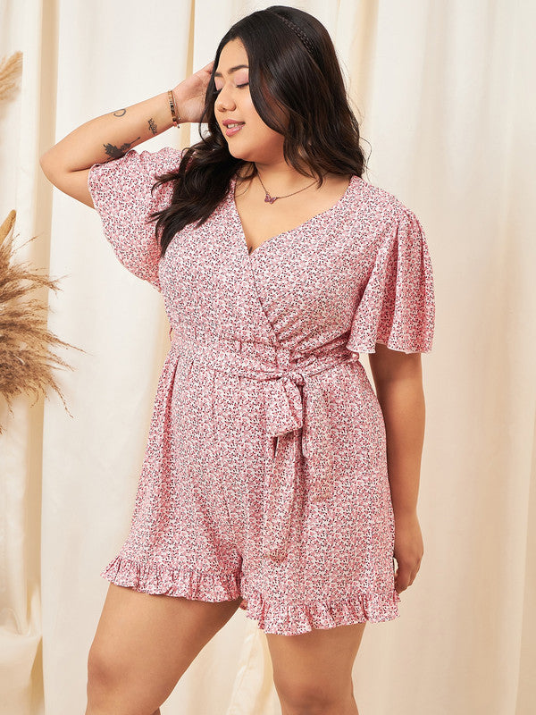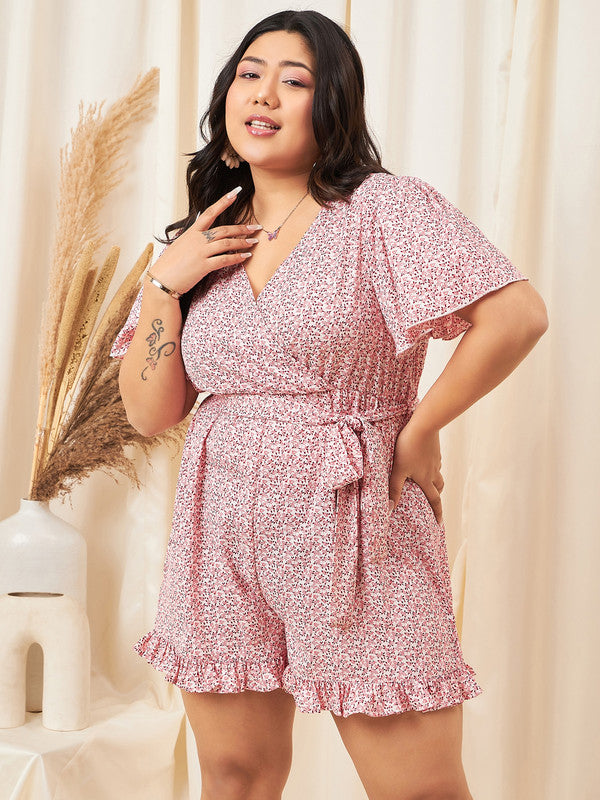 Berrylush Curve Women White & Pink Floral Printed V-Neck Cape Sleeves Waist Tie-Up Wrap Pleated Mini Jumpsuit