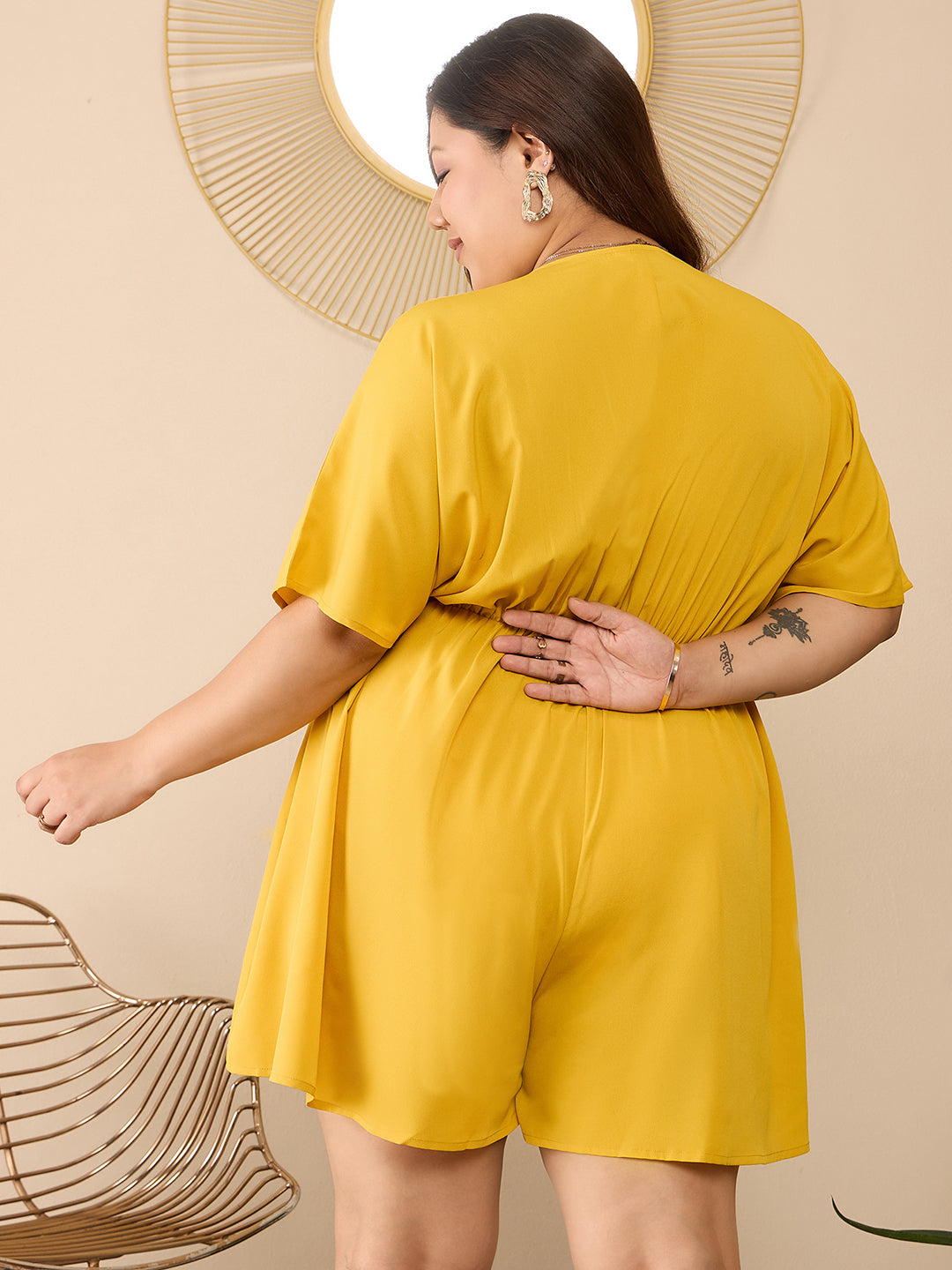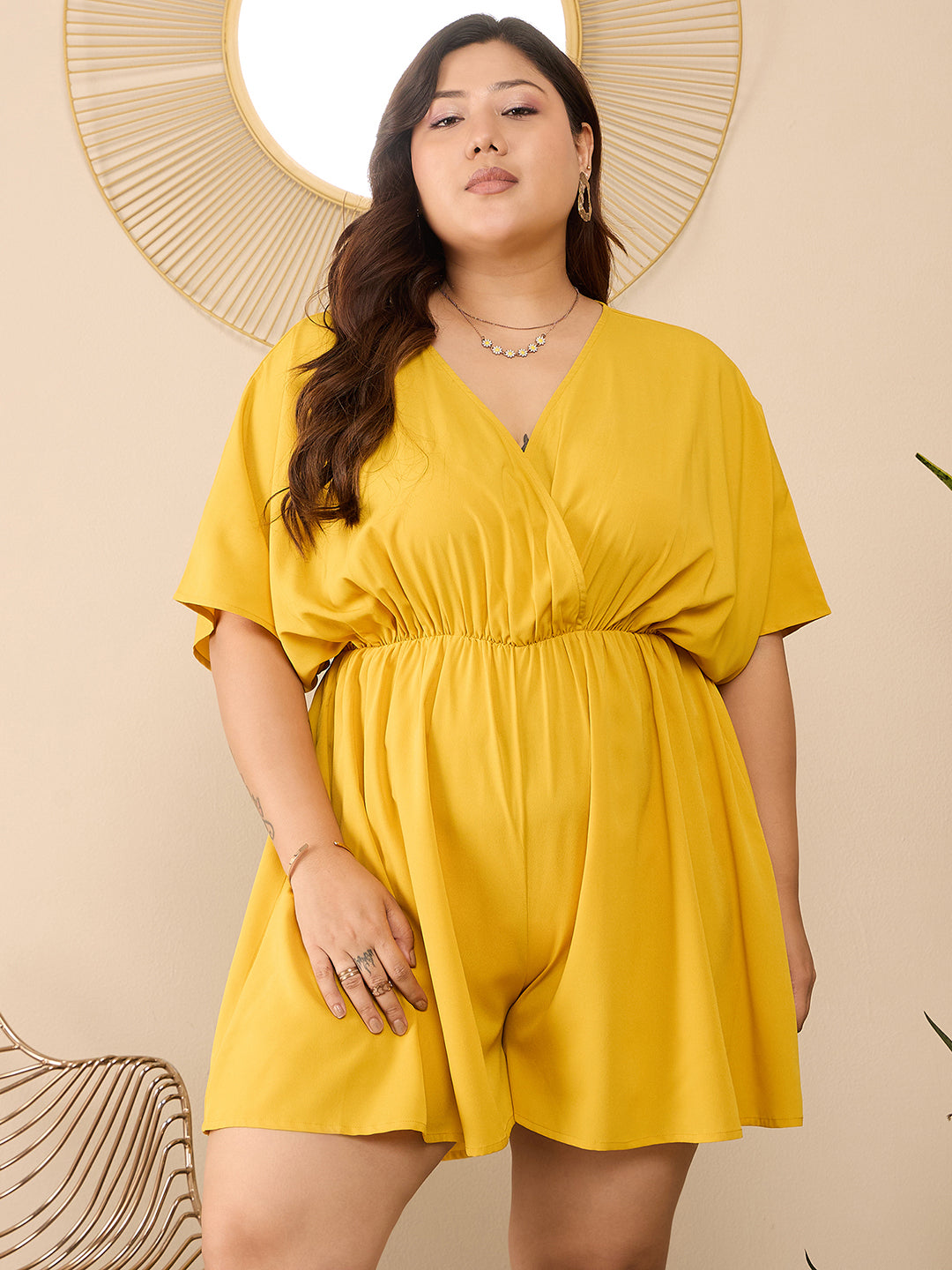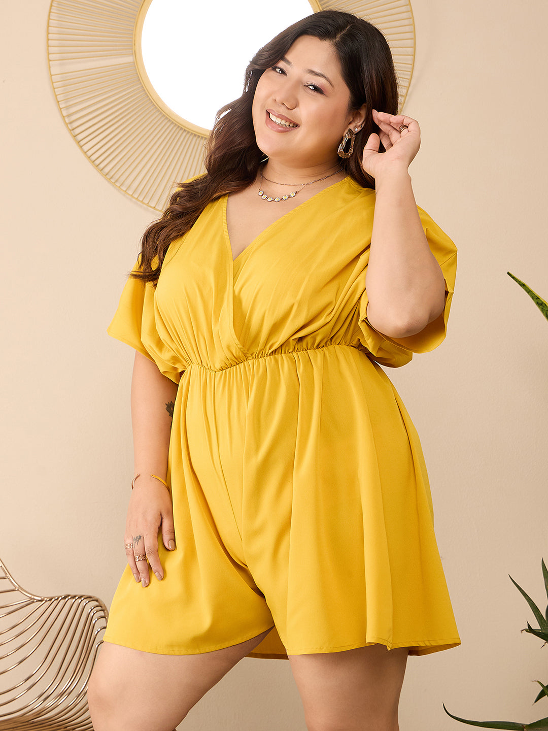 Berrylush Curve Women Solid Yellow V-Neck Cape Sleeves Cinched Waist Wrap Mini Jumpsuit