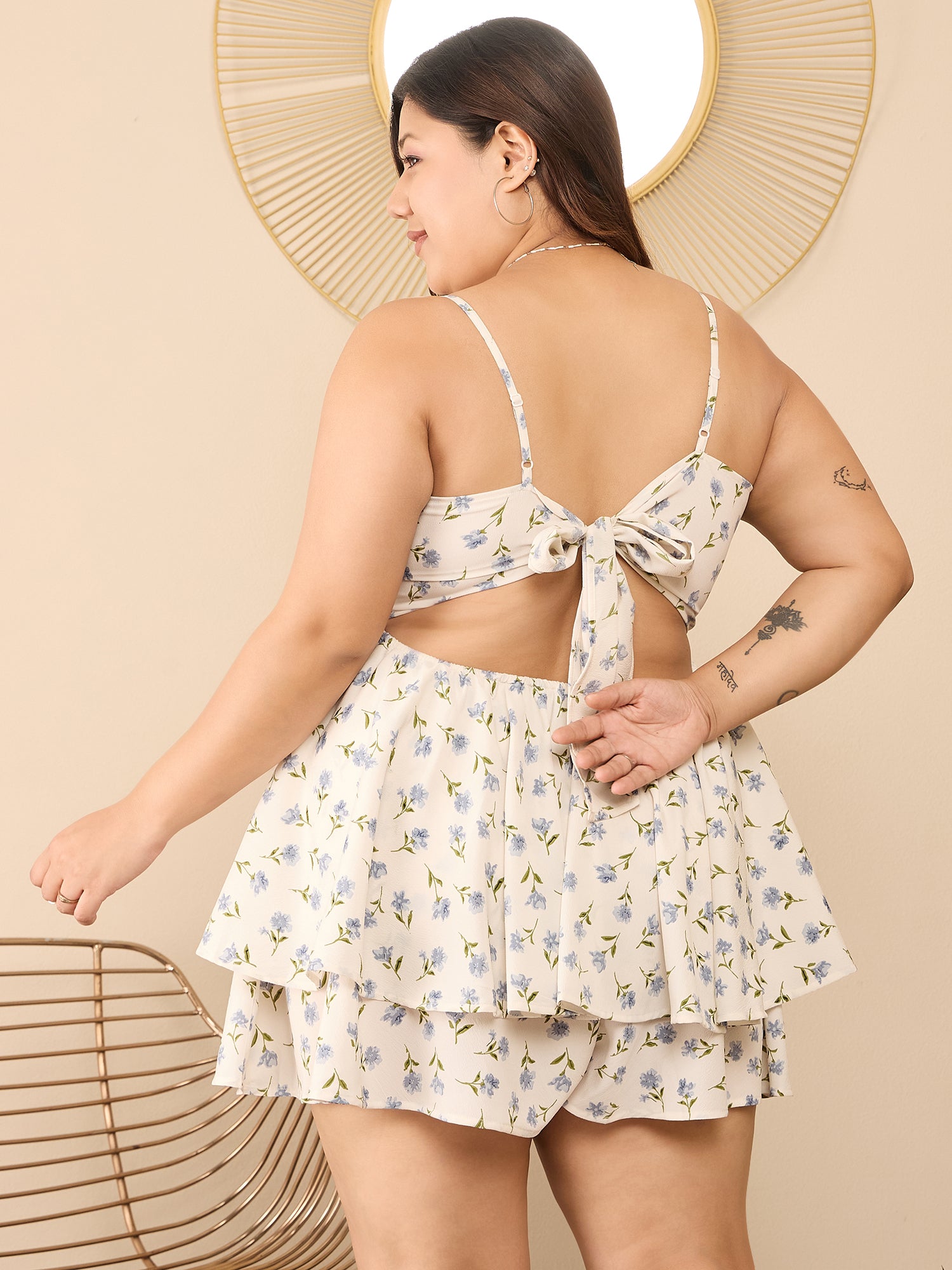 Berrylush Curve Women White & Blue Floral Printed Square Neck Sleeveless Back Cutout Tie-Up Layered Mini Jumpsuit