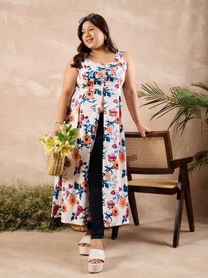 Berrylush Curve Women White, Blue, & Orange Floral Printed Round Neck Sleeveless Front-Slit Flared A-Line Calf-Length Kurta