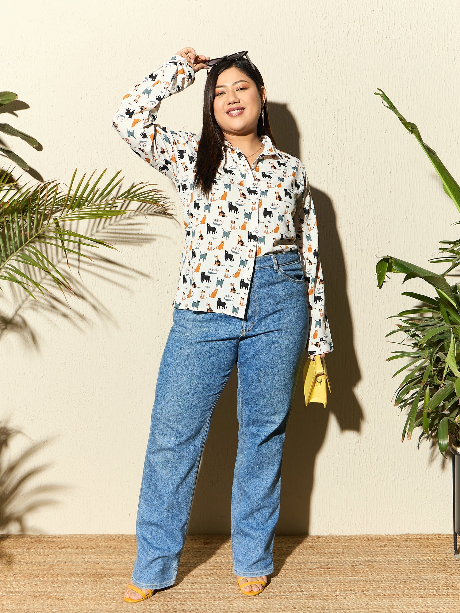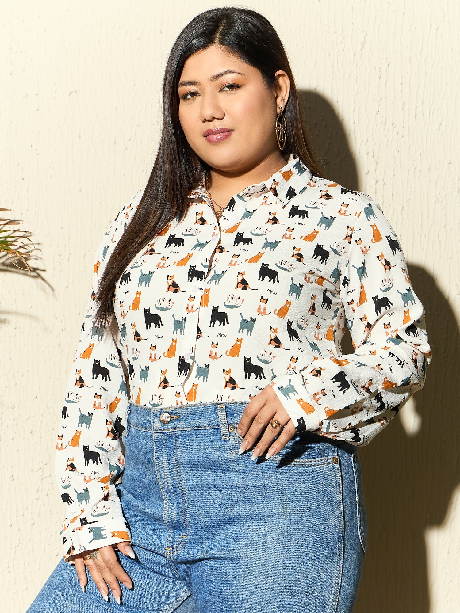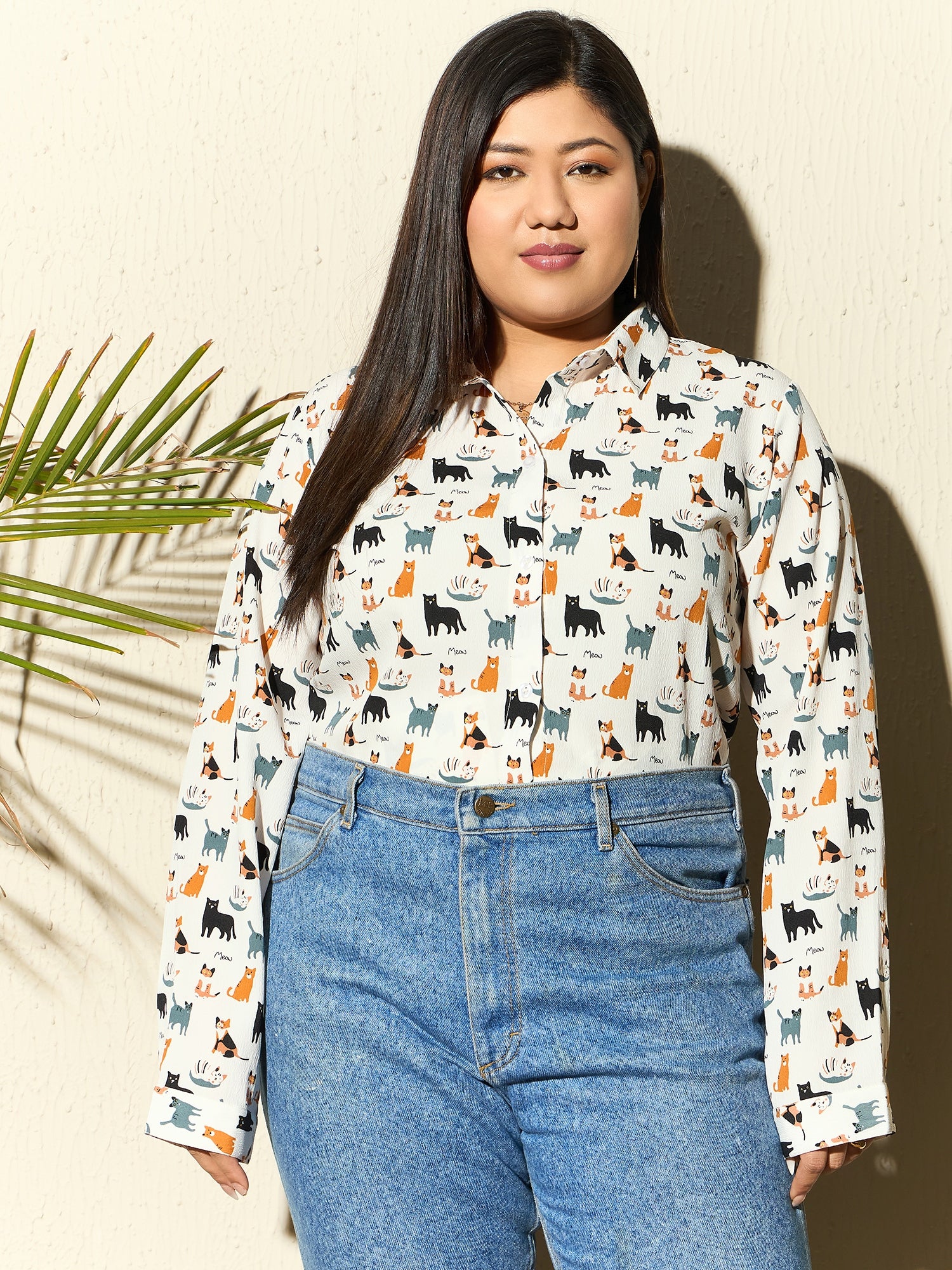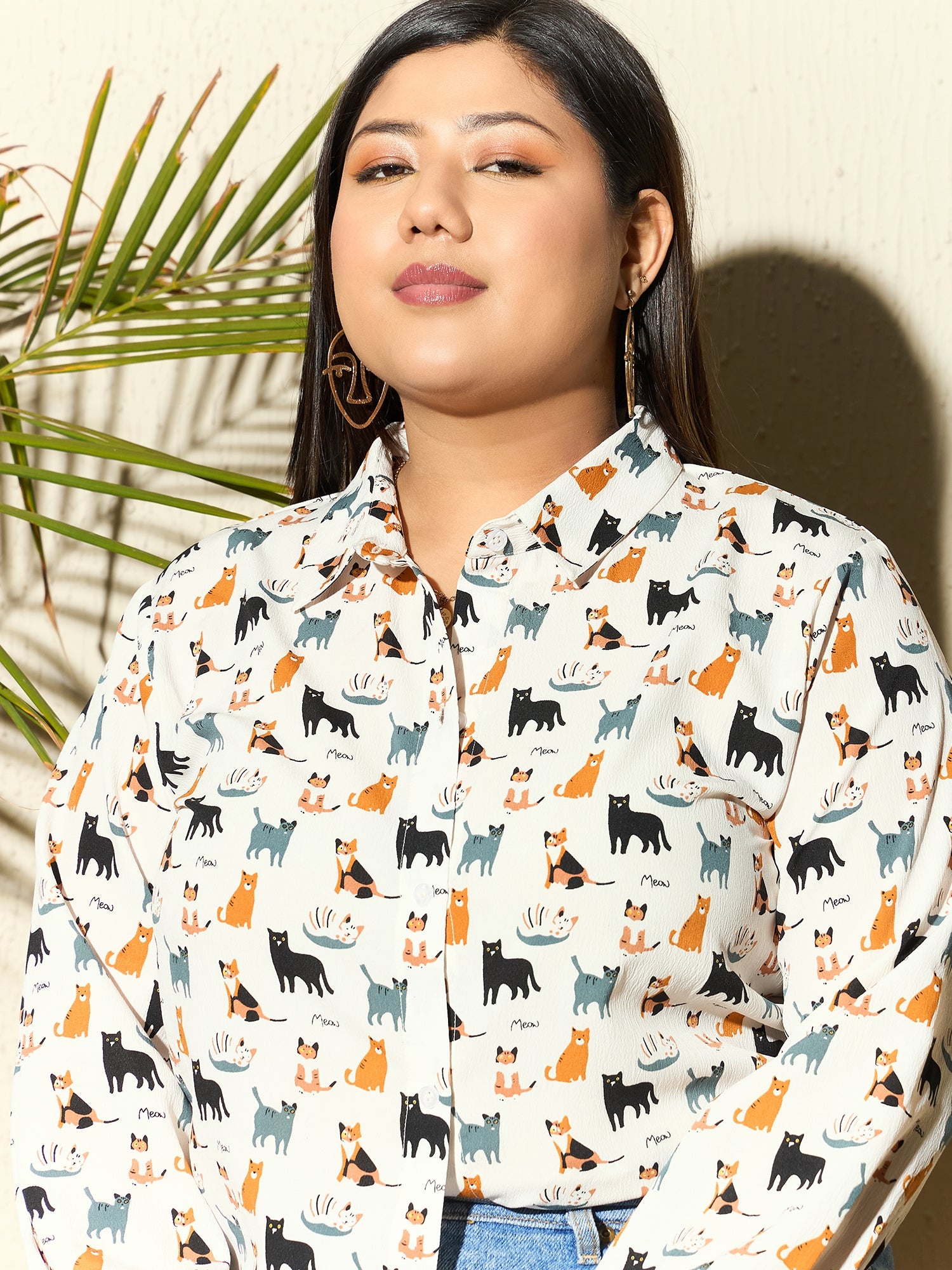 Berrylush Curve Women White & Multicolour Cat Printed Spread Collar Neck Front Button-Up Straight Hem Regular Shirt