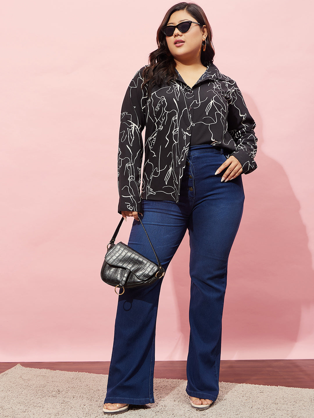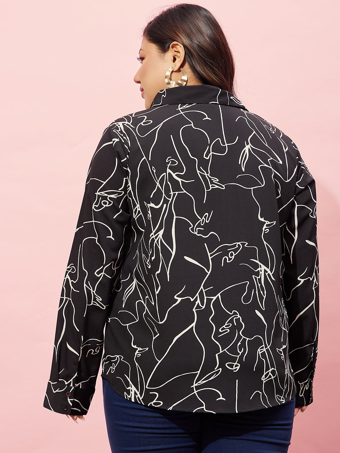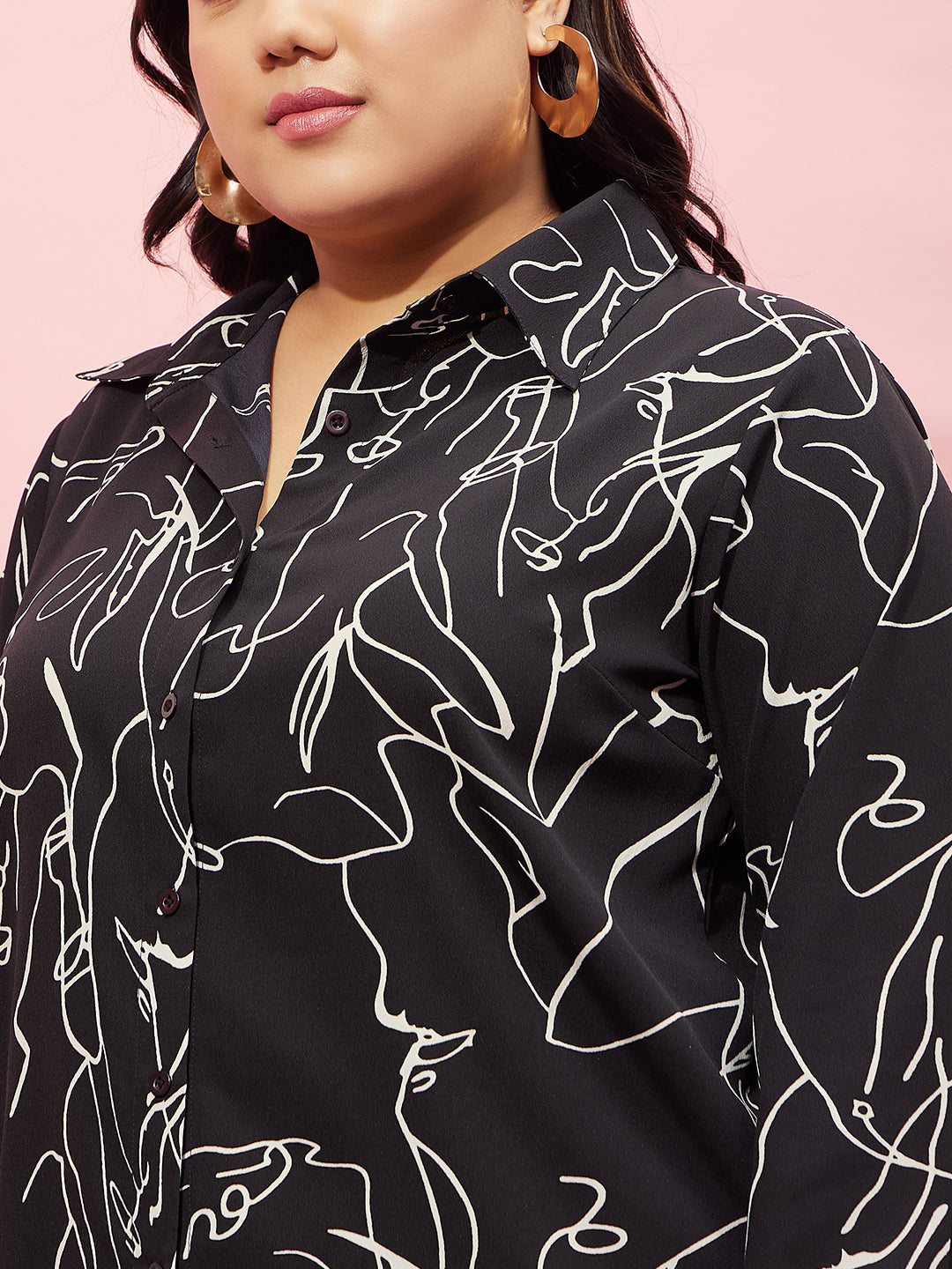 Berrylush Women Plus Size Black & White Abstract Printed Spread Collar Neck Button-Up Curved Hem Regular Shirt