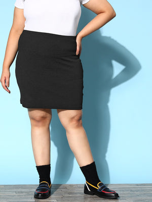 Berrylush Women Plus Size Solid Black Crepe Straight Hem Pencil Mini Skirt
