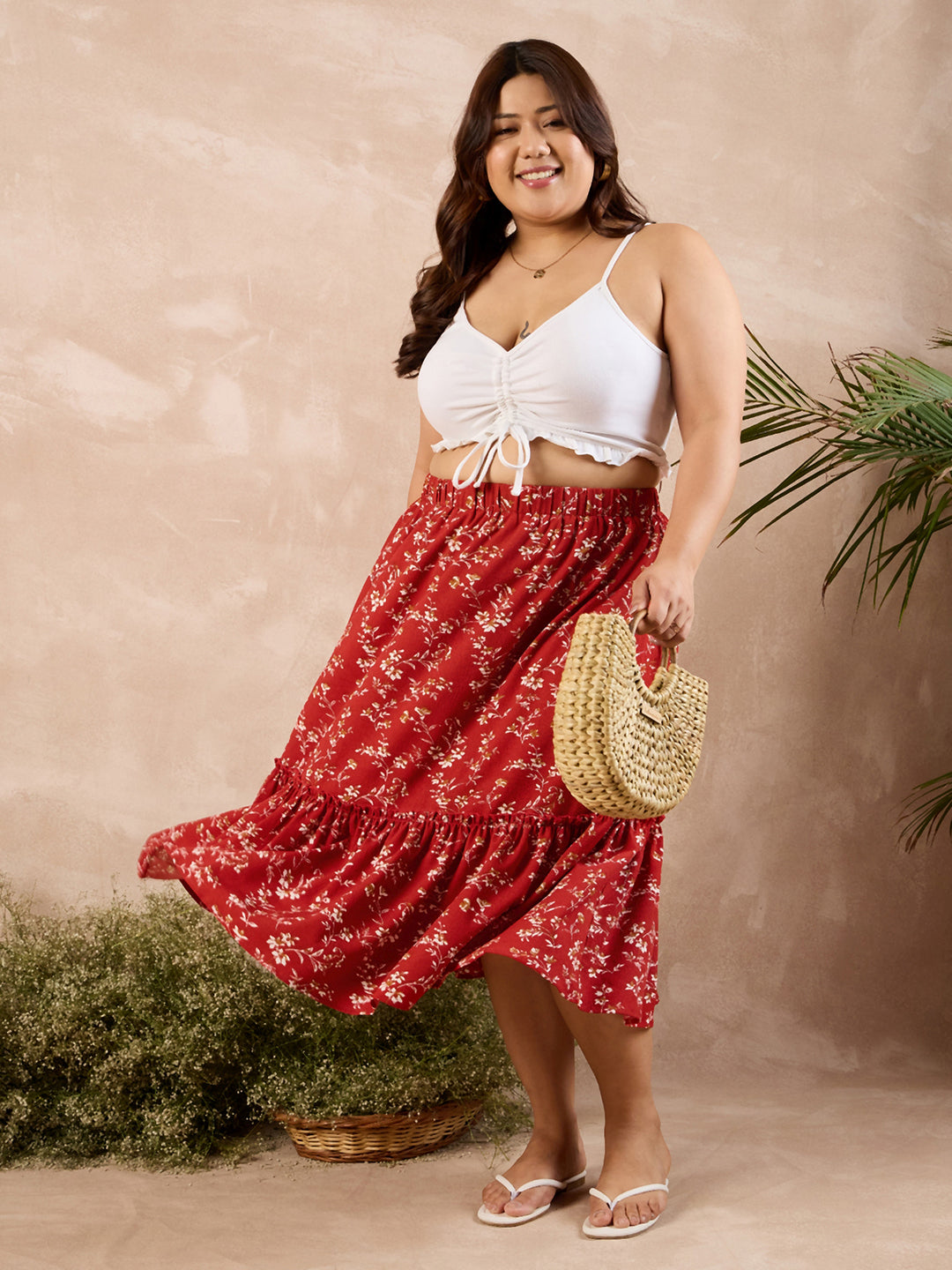 Berrylush Curve Women Red & White Floral Printed High-Rise Elastic Waist Slip-On Gathered A-Line Midi Skirt