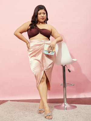 Berrylush Women Plus Size Solid Pink High-Rise Waist Front-Slit Tulip Hem Ruched Midi Skirt