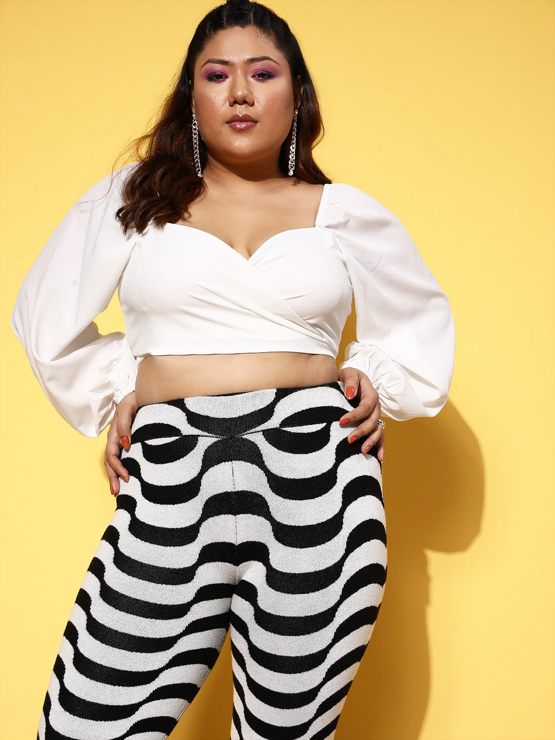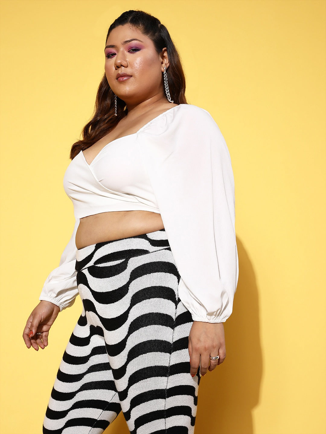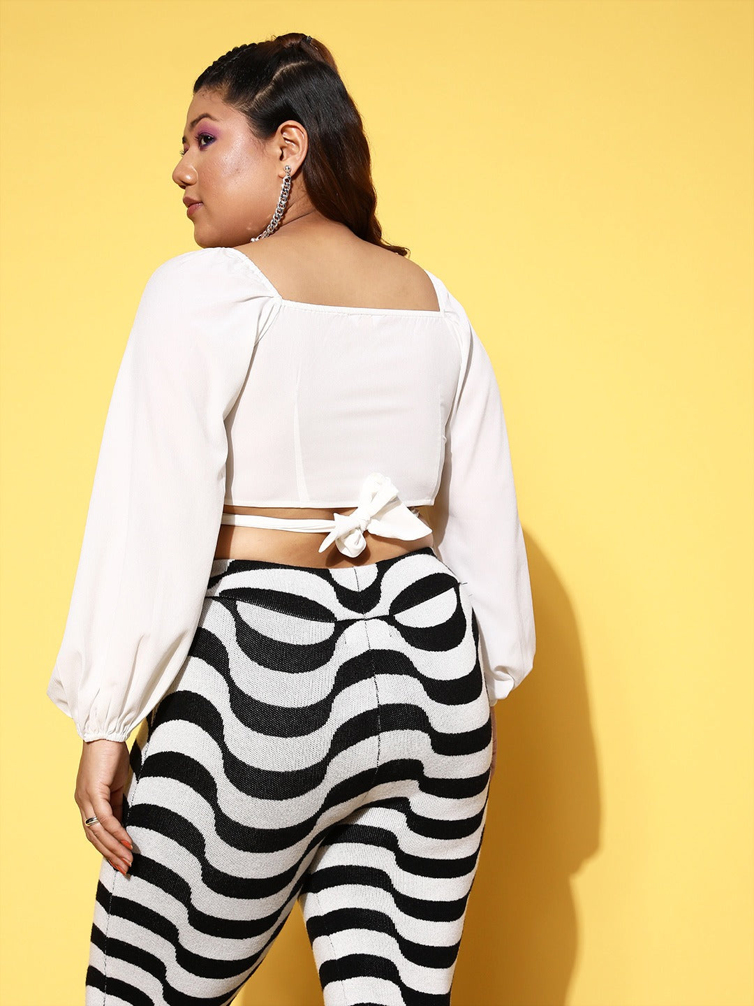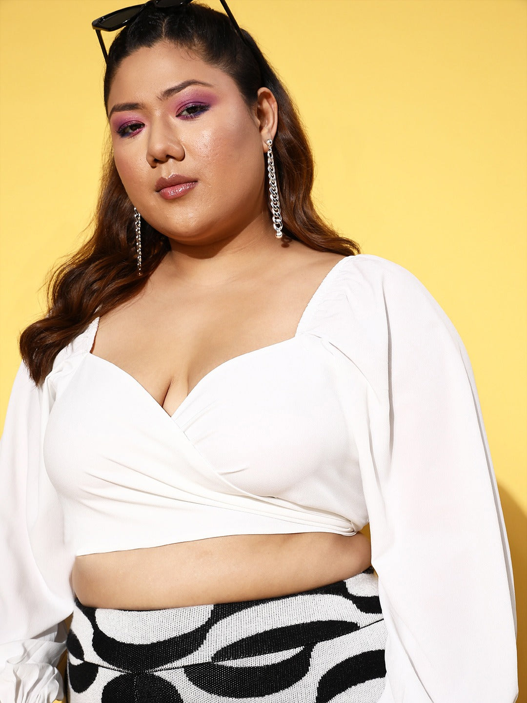 Berrylush Women Plus Size Solid White Sweetheart Neck Waist Tie-Up Crepe Wrap Cropped Top