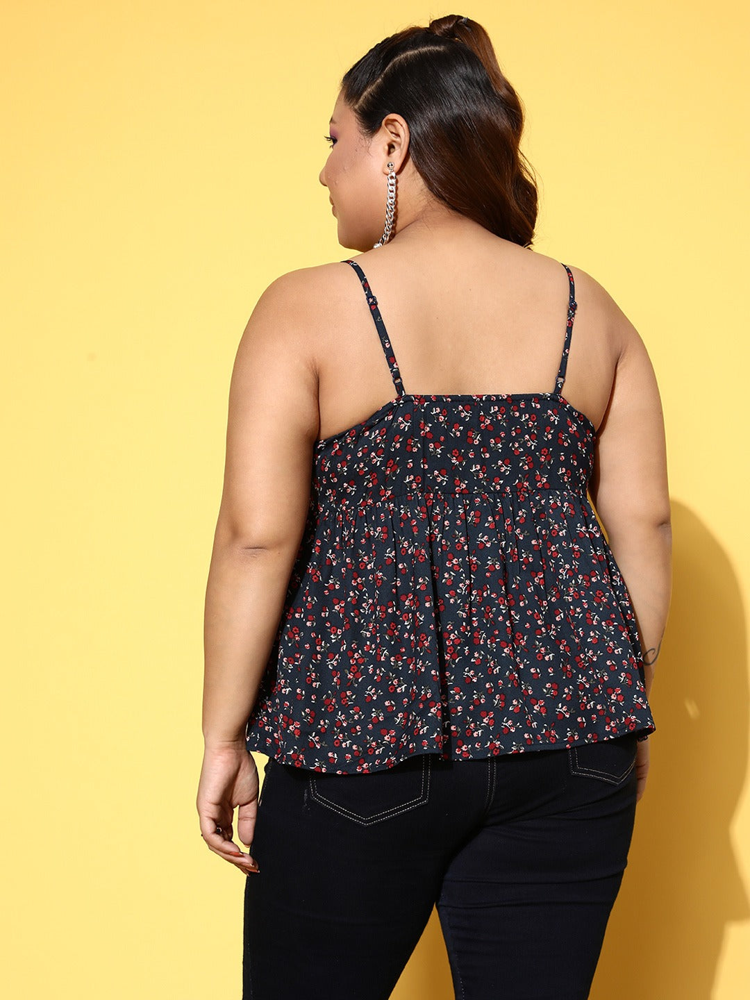 Berrylush Women Plus Size Navy Blue & Red Floral Printed V-Neck Sleeveless Crepe Pleated Empire Top
