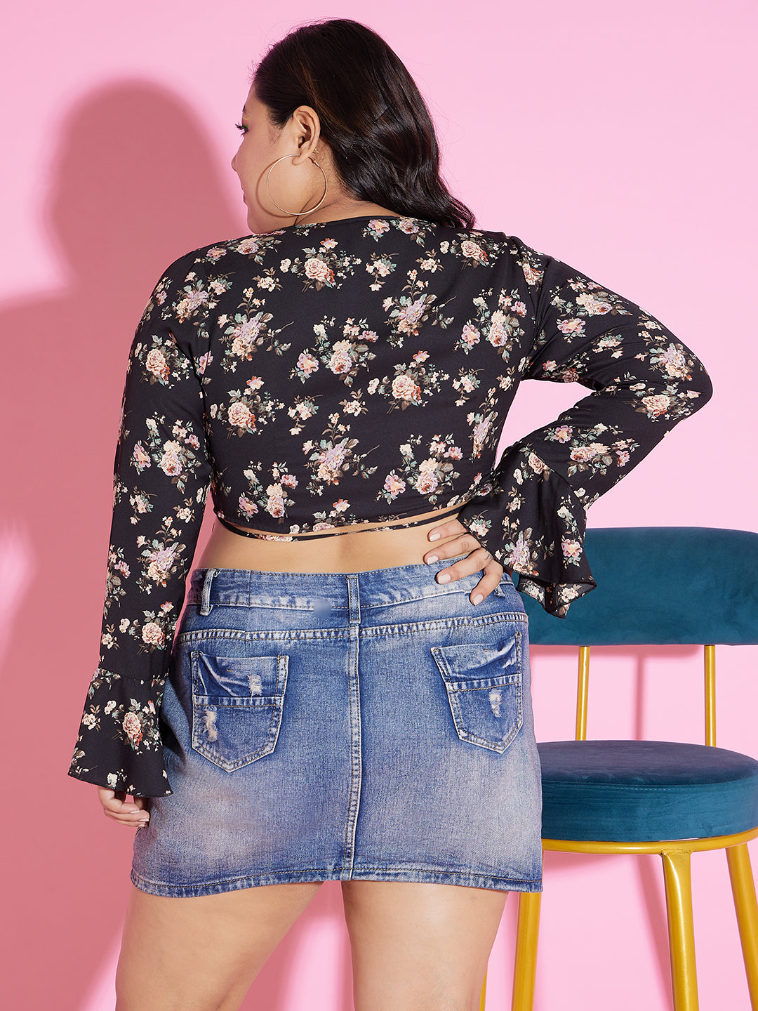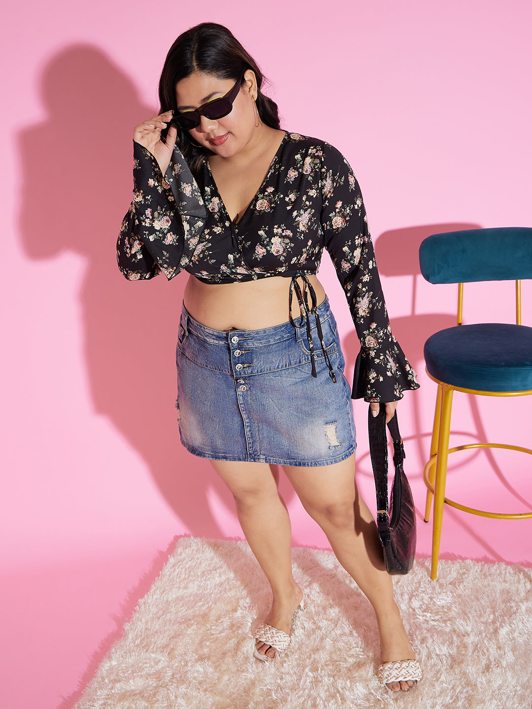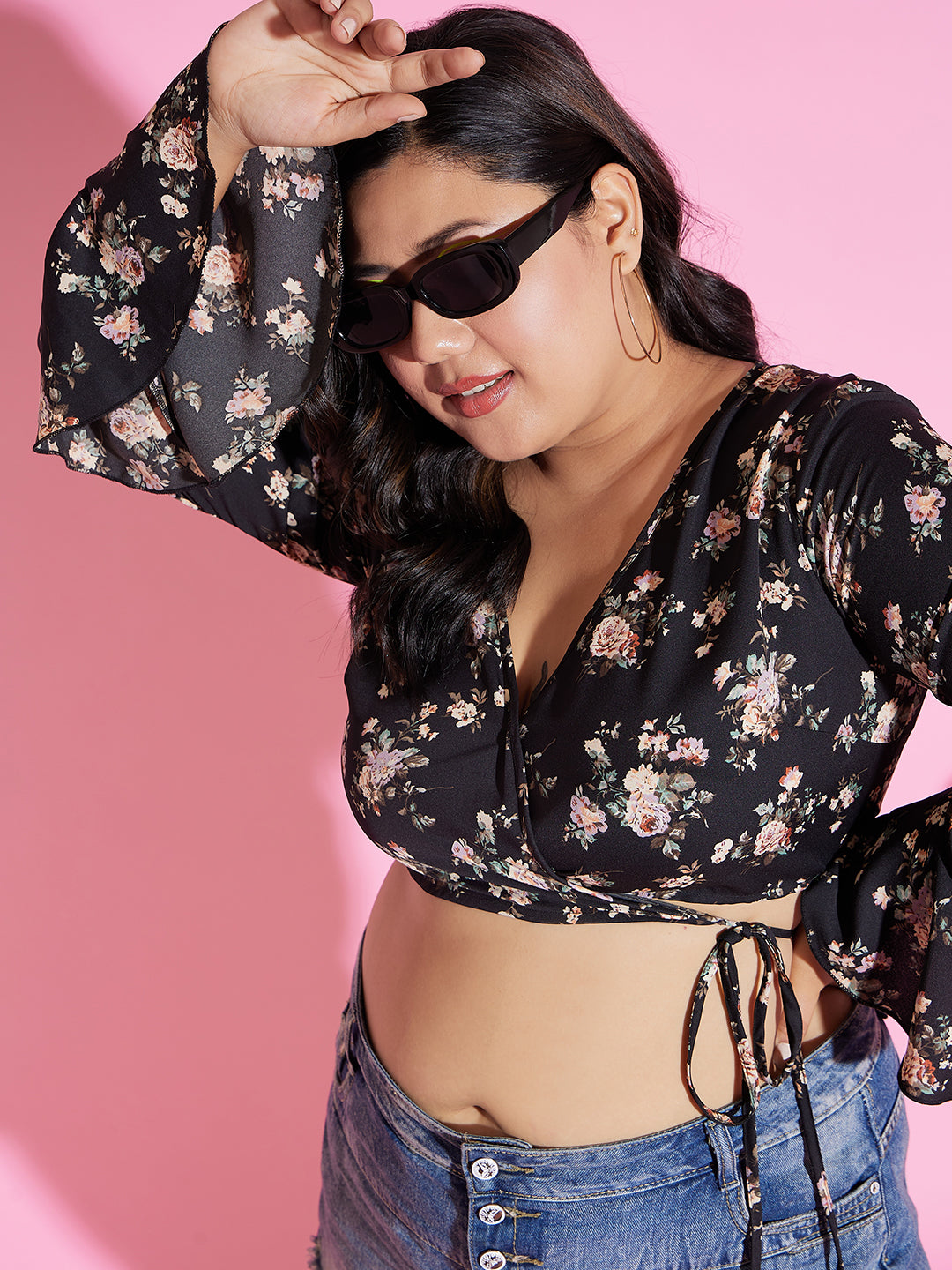 Berrylush Women Plus Size Black & White Floral Printed V-Neck Flutter Sleeve Tie-Up Side Wrap Cropped Top