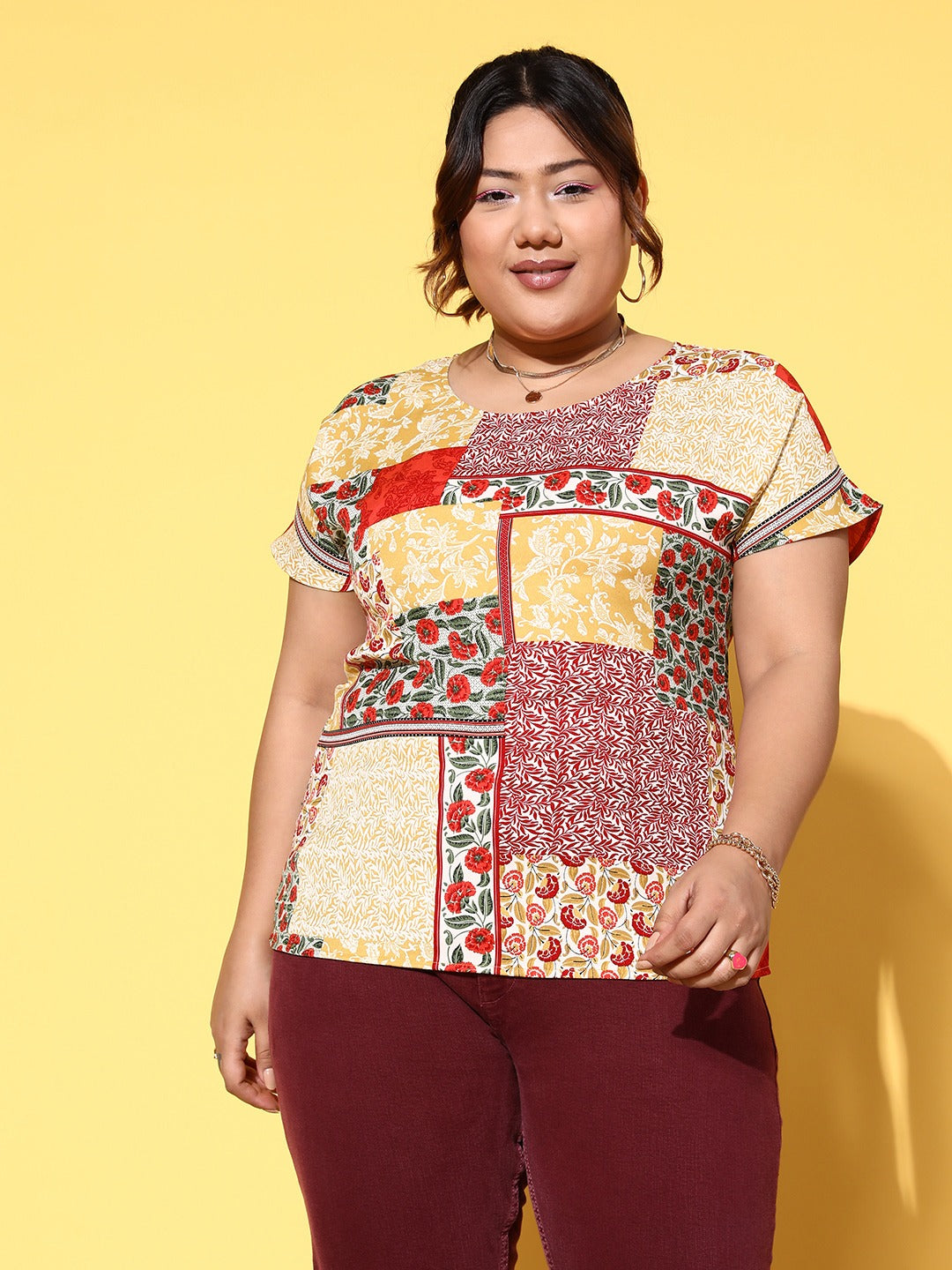 Berrylush Women Plus Size Red & Yellow Floral Printed Round Neck Slip-On Polyester Regular Top