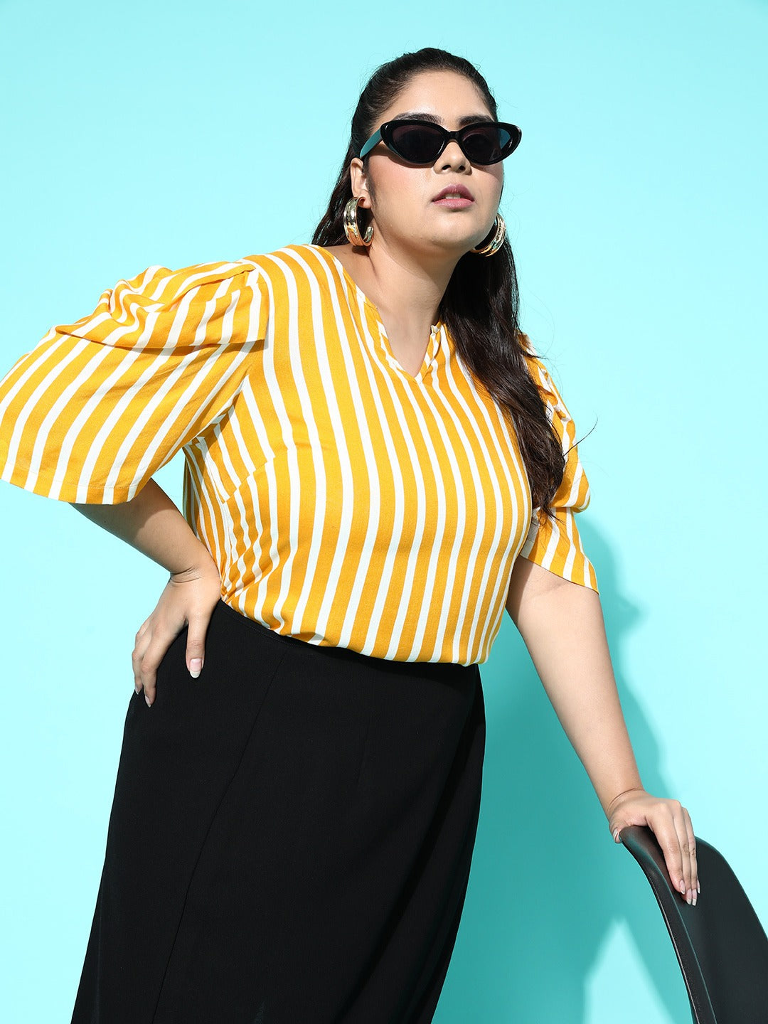 Berrylush Women Plus Size Yellow & White Vertical Striped Print V-Neck Puff Sleeve Cotton Regular Top