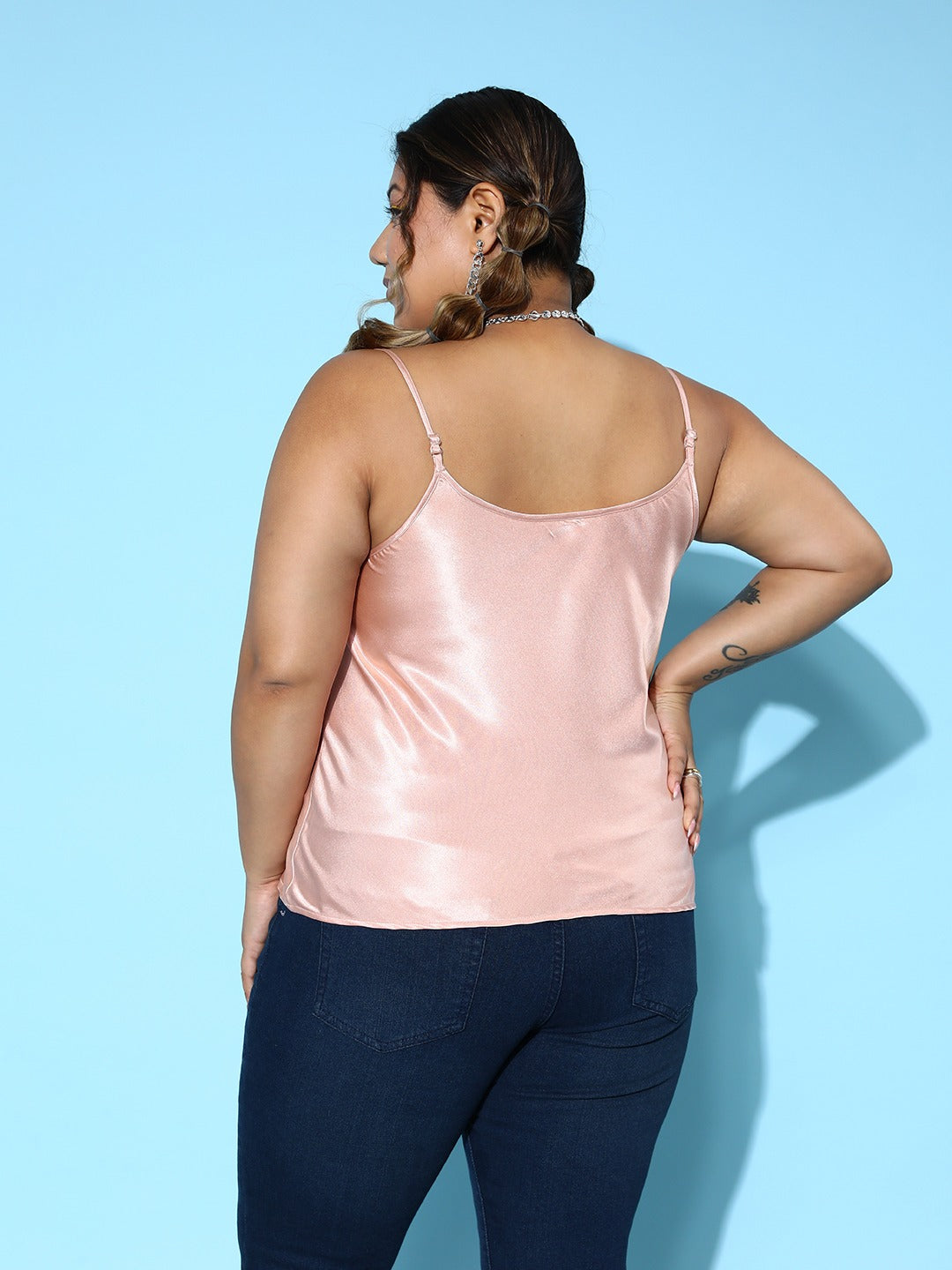 Berrylush Women Plus Size Solid Peach Draped Neck Sleeveless Satin Cami Top