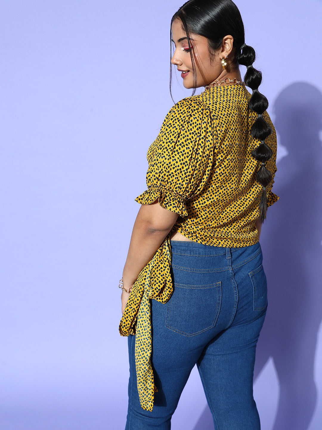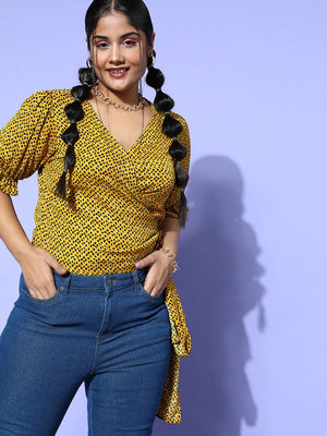 Fashion is what your own and style is what you possess, thus glam up your closet with the style that defines you just like this captivating Yellow and Black Animal Print Wrap Crop Top from Berrylush. The most adorable element of this top is its short-puff sleeves which add a dash of retro charm with enchanting and appropriate coverage to your arms. Designed in crop length to make this top appear enticing with an alluring disclosure of your feminine curves. Rendered from the finest crepe polyester fabric to lend this top total airflow to keep you comfy with the anti-stain property. Create a fashion-focused look by wearing this crop top with high-waist jeans, hoop earrings, and an animal print side bag.