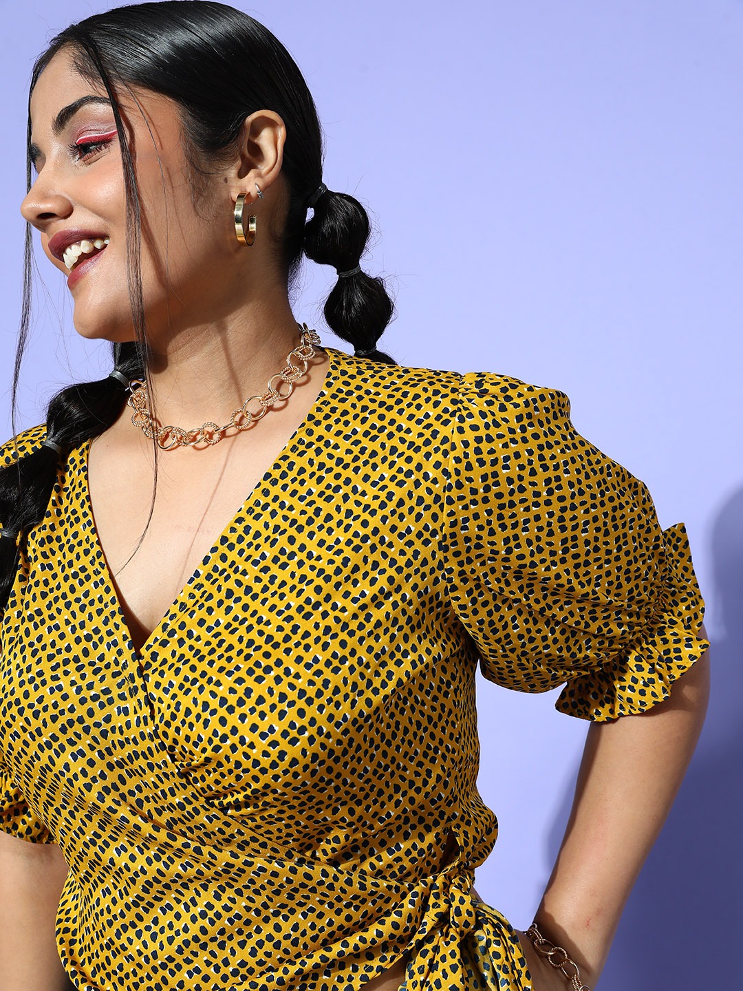Berrylush Women Yellow & Black Animal Printed V-Neck Waist Tie-Up Crepe Wrap Crop Top