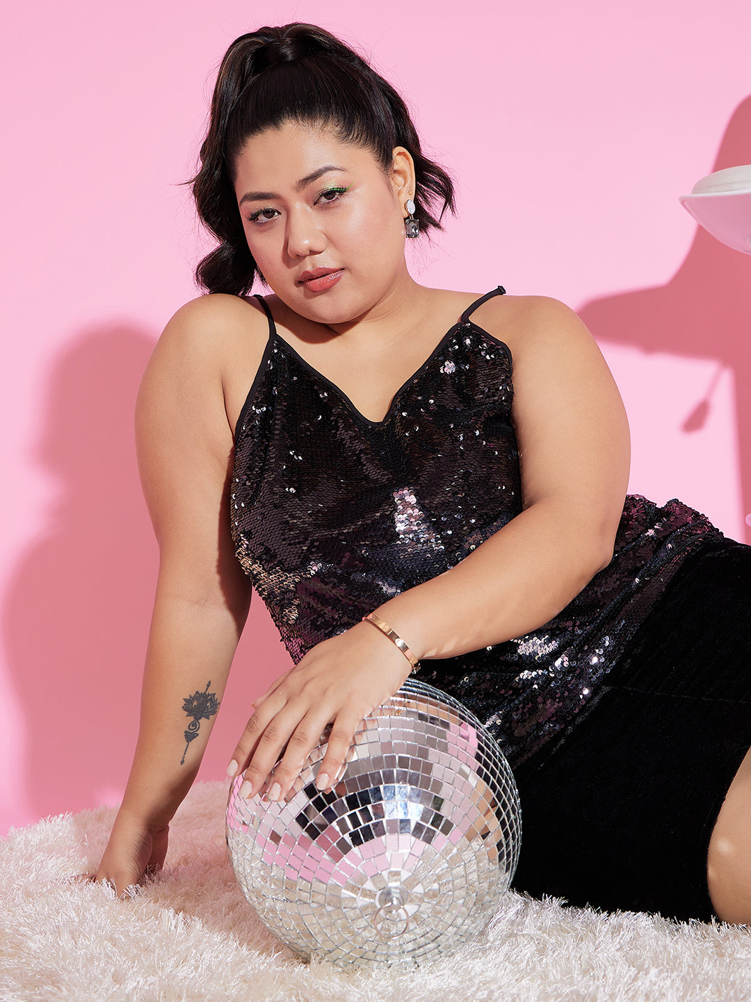Berrylush Women Plus Size Solid Black V-Neck Sleeveless Sequin Embellished Regular Cami Top